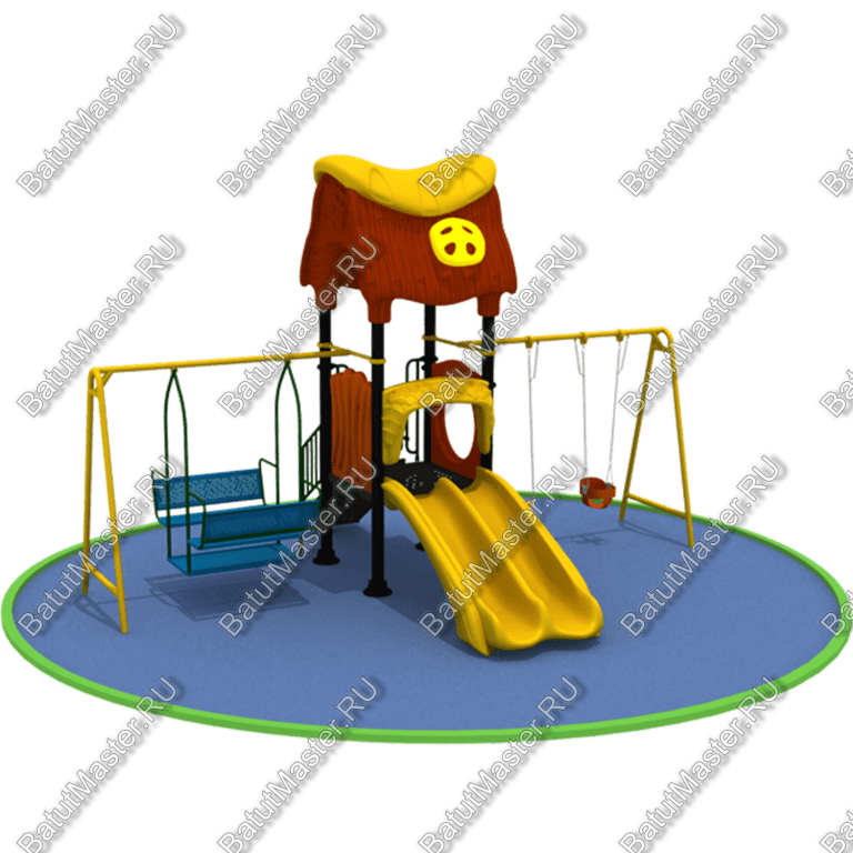 Большая детская горка с несколькими видами качелей.