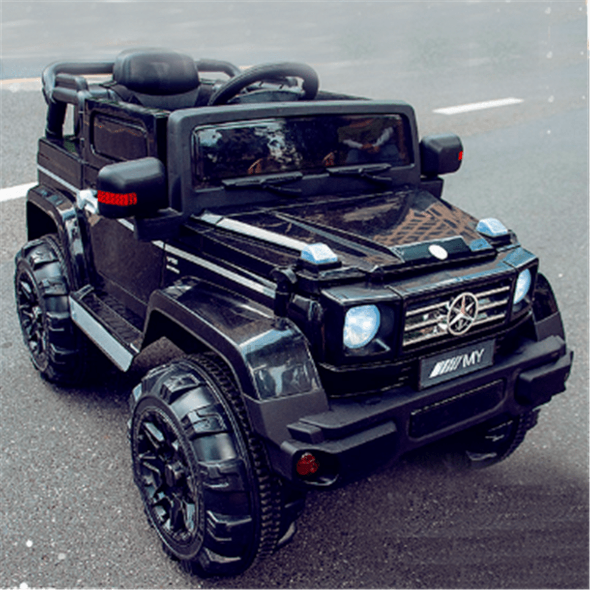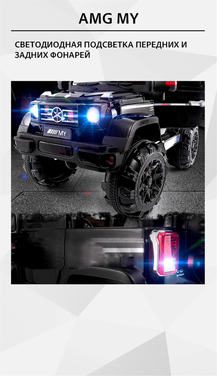 Электромобиль «AMG My» позволяет детям почувствовать себя настоящими водителями. Но чем же ещё так хорош этот электромобиль? Насыщенный чёрный цвет, большие габариты, солидный вид, работающие фары – главные особенности «AMG My». Детям станет интересно прокатиться на таком транспорте.