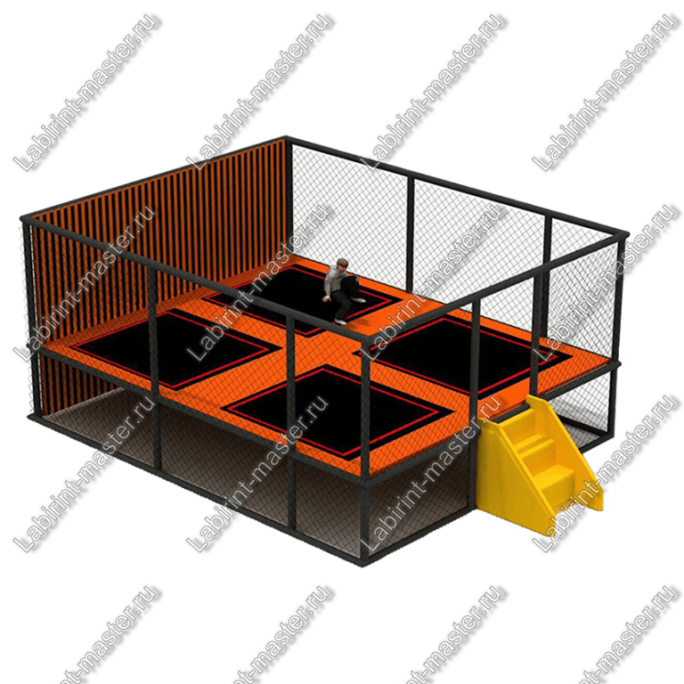Всего в комплексе присутствует четыре так называемых зоны, состоящих из чёрных батутных квадратов. На каждой из этих зон может поместиться несколько детей, поэтому разом на нём может разместиться немало ребятишек, желающих попрыгать. У комплекса имеется жёлтая небольшая лестница. Стоит отметить, что именно жёлтый цвет отлично разбавляет общую строгую гамму цветов. Он выделяет этот аттракцион и делает его не таким официальным.