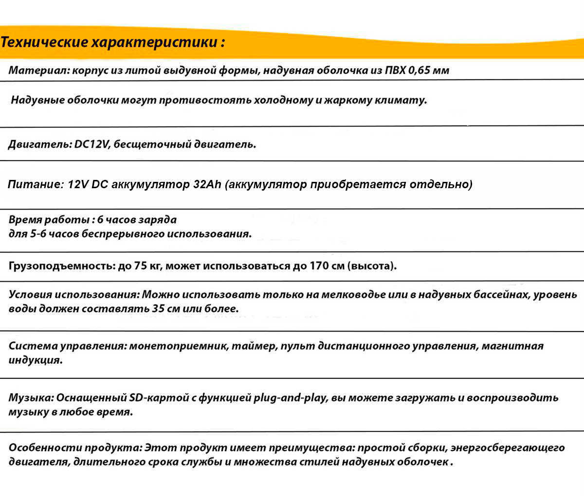 Дополнительно лодка оснащена музыкальным модулем с SD-картой, позволяющим воспроизводить музыку во время катания. Это создаёт праздничную атмосферу и делает аттракцион ещё более привлекательным для детей.