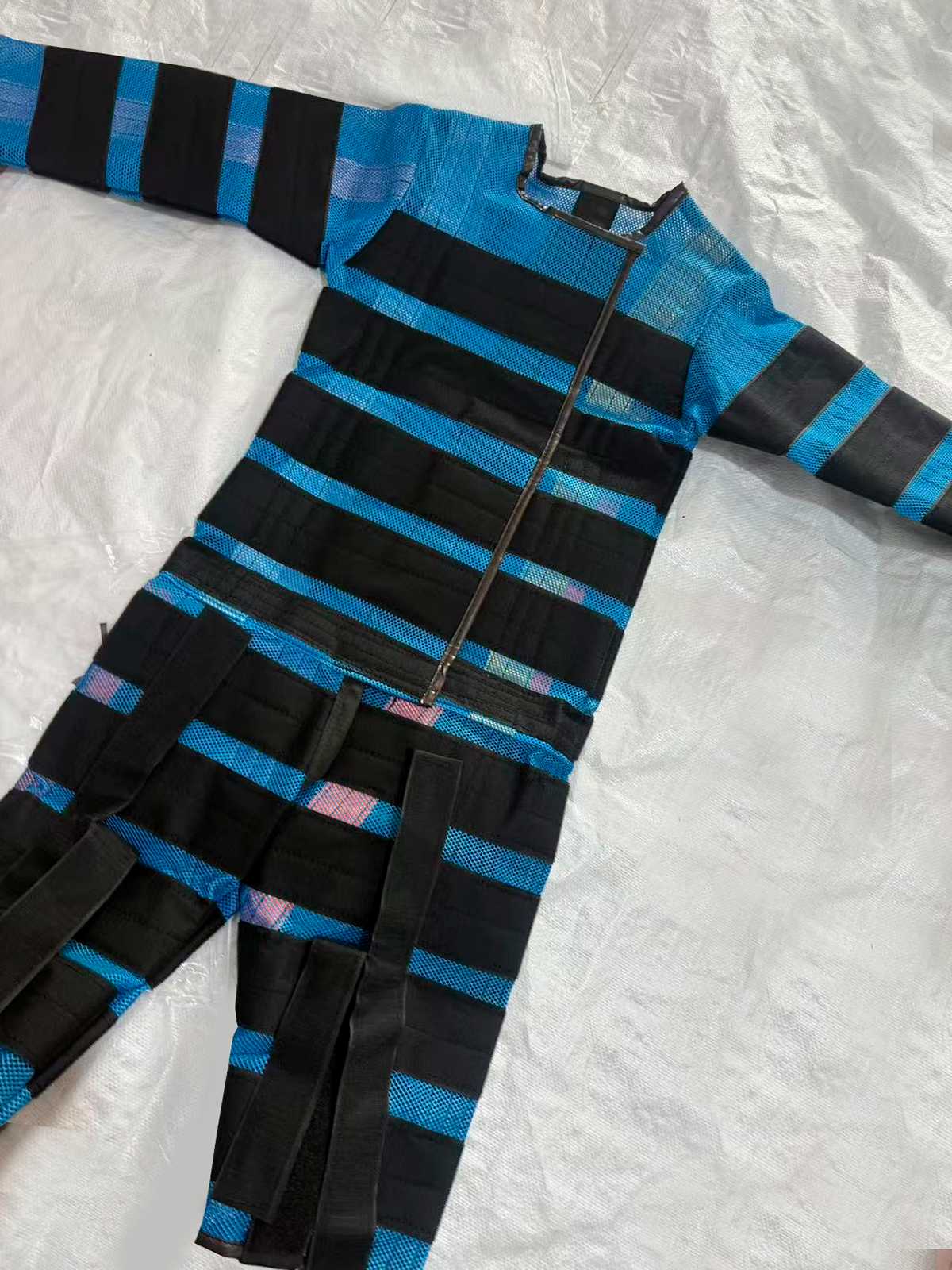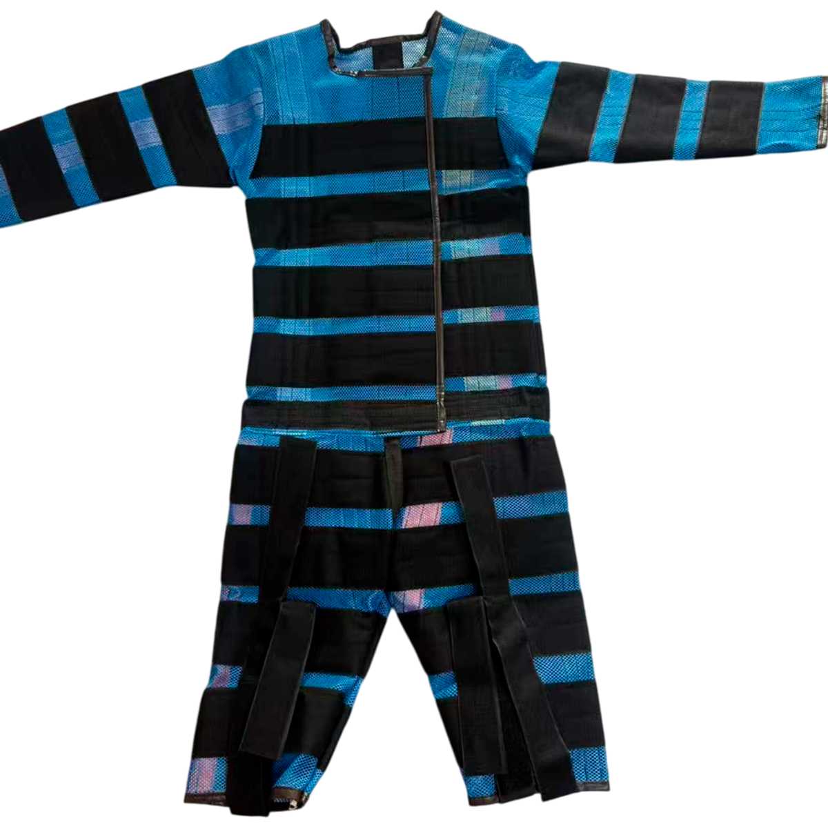 Костюм выполнен в синем цвете с черными широкими липучими полосами по всей длине.