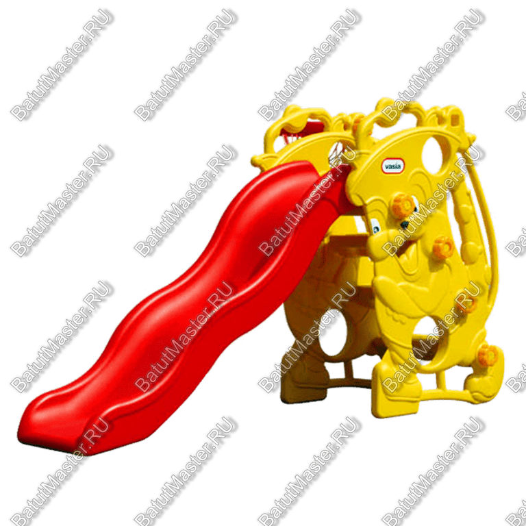 Маленькая детская горка состоит из нескольких основных деталей: двух боковых стенок-опор, лестницы для подъема детей, площадка и непосредственно сам спуск ярко красного цвета. Именно эта комплектующая оборудования своей волнообразной конструкцией напоминает язык животного. Для подъема детей наверх изготовлены поручни, которые являются продолжением хвоста животного. Конструкция очень легкая, но устойчивая. Все детали и их соединительные элементы выполнены из литой пластмассы красного и желтого цвета.