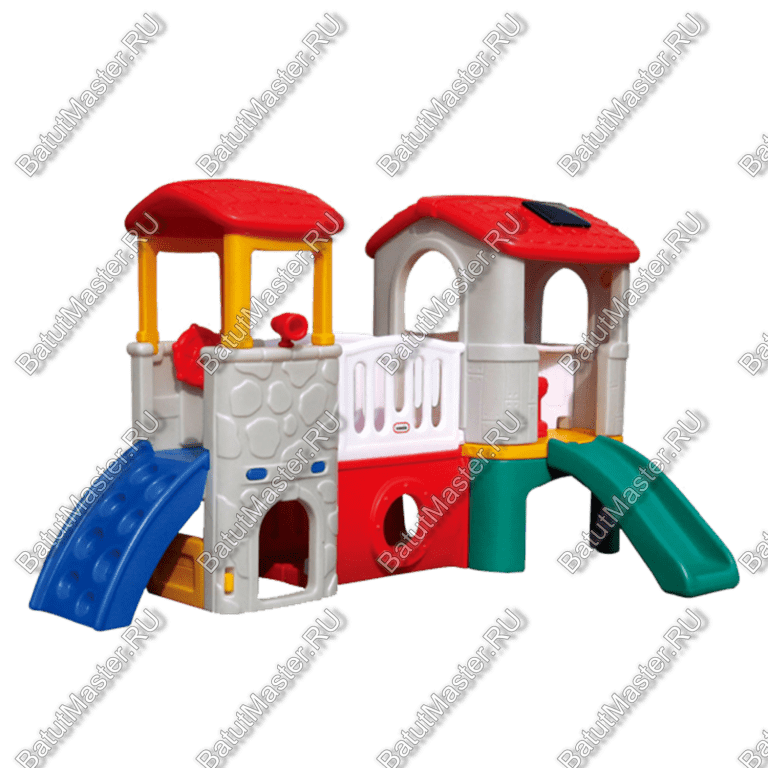 Маленькая детская горка представлена в виде сразу двух сказочных домиков, вернее, целым комплексом с мостиком посередине. Под каждым домиком имеется свободное пространство, которое дети всегда с удовольствием используют для своих игр. Две горки позволяют разделиться на возрастные категории и пользоваться игровым оборудованием безопасно, не сталкиваясь друг с другом. Материалом для данной комплектующей конструкции служит литая пластмасса, которая полностью удовлетворяет всем нормам безопасности. Домики имеют крышу, позволяющую спрятать детей от дождя, если игровое оборудование будет установлено на улице.