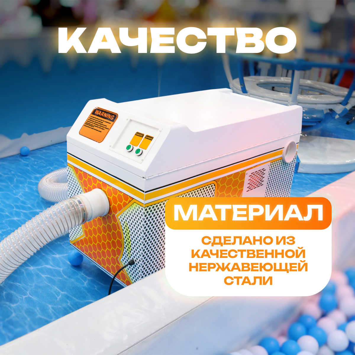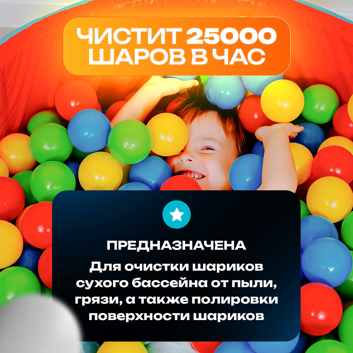 Машина для чистки и дезинфекции обладает привлекательным дизайном. Для сухой чистки шаров для нее не нужно подводить воду и слив, достаточно только размещения у бассейна. После включения она за несколько десятков минут перемоет все шарики внутри емкости. Для эксплуатации не требуется специальных знаний, работать с машиной может неподготовленный сотрудник.