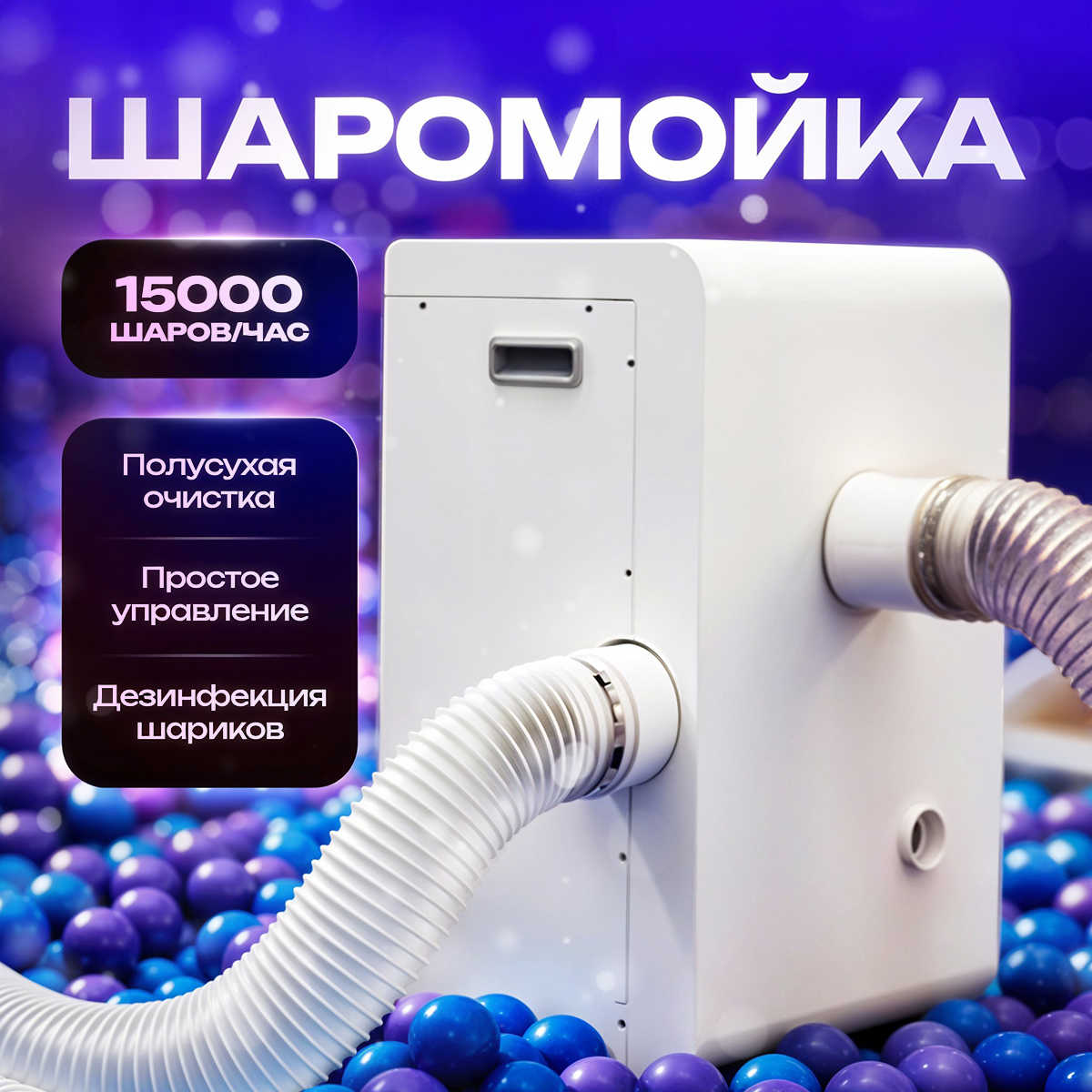Сухой бассейн популярный аттракцион в игровых комнатах. Такие емкости больших и малых размеров всегда пользуются особым вниманием маленьких посетителей. Для мойки шаров компания ЛабиринтМастер предлагает машину способную очистить за час до 15 тысяч шариков.
