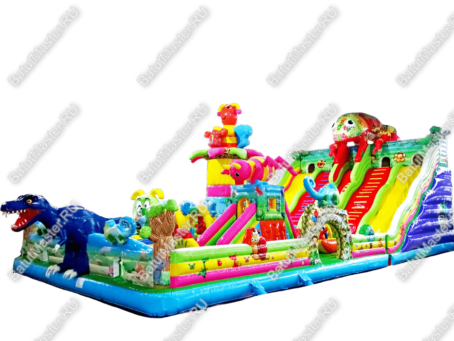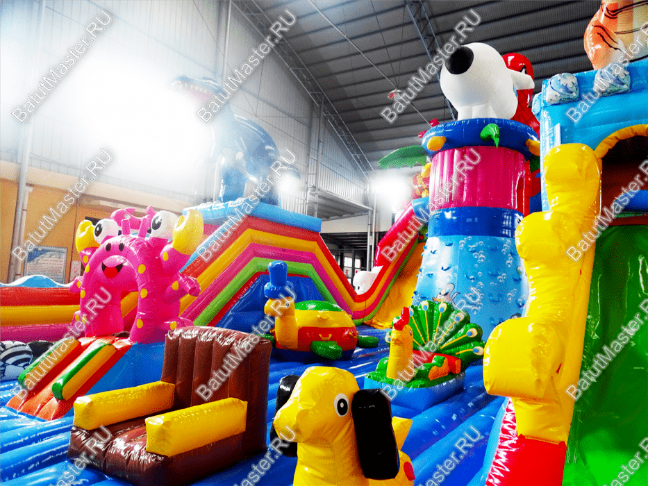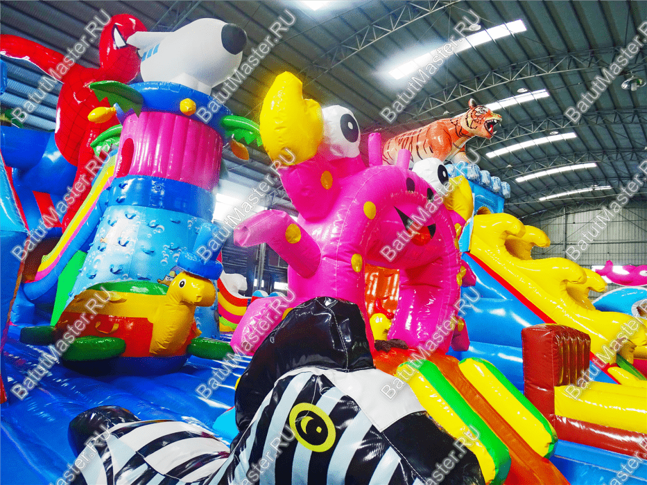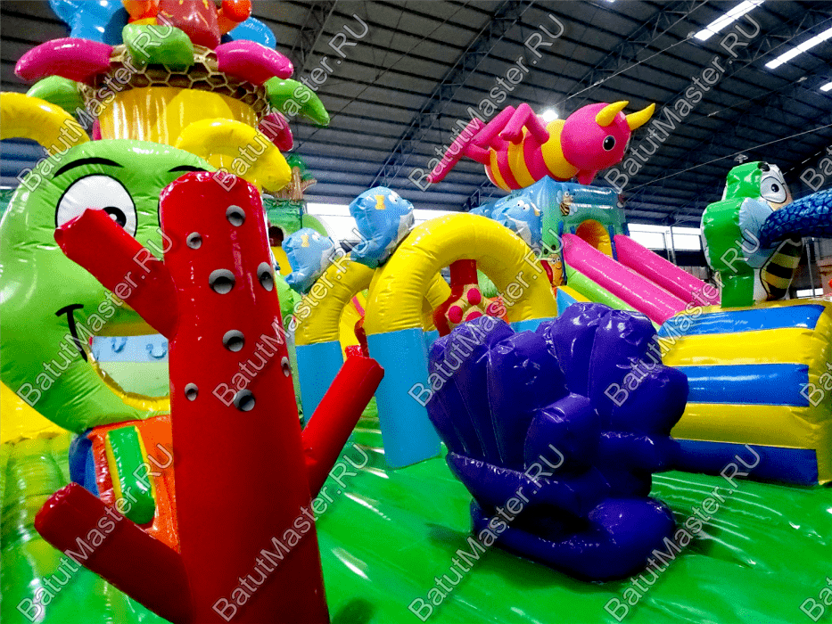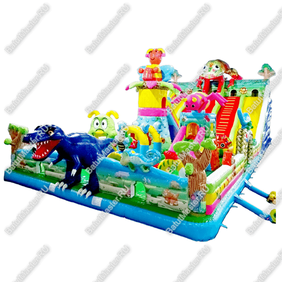 Пройдя внутрь батута, дети попадают на игровую площадку с установленными на ней фигурами животных, птиц, черепах и огромных пауков. Но на этом игровое наполнение не заканчивается, так как здесь есть и небольшие препятствия в виде горок, кресел, арок, скалодрома. Кстати, зайти внутрь батута можно и через правую стенку надувного батута, которая вверху украшена фигурой голубого дракона. В окончании площадки детей ждет увлекательная высокая горка с фигурой надувного паука над стартовой площадкой