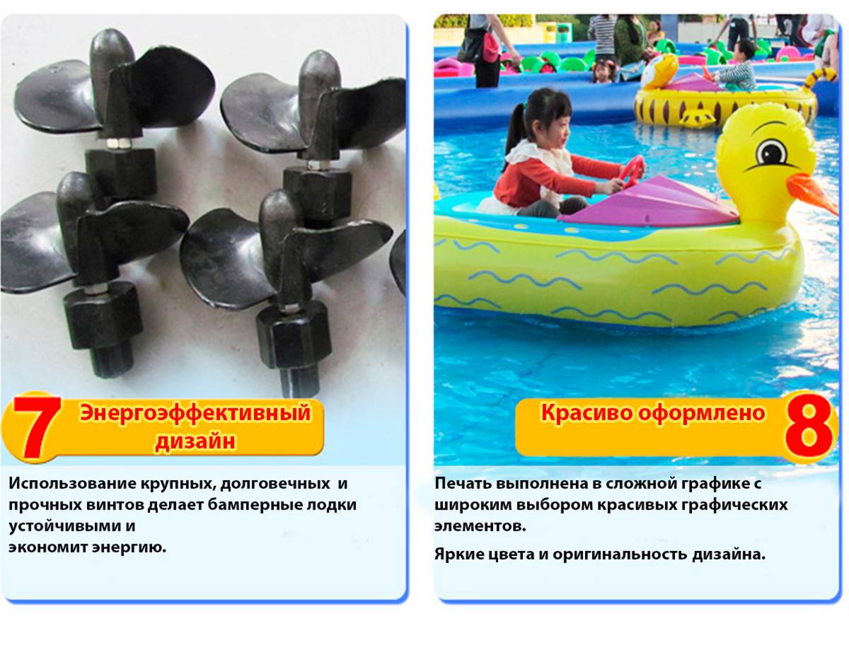 Лодочка изготовлена из пластика, что делает её прочной и устойчивой к воздействию воды и солнечных лучей. Благодаря этому аттракцион можно использовать как в крытых бассейнах, так и на открытых водоемах.