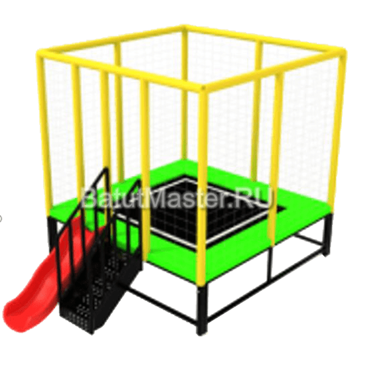 Модель представлена в стиле минимализма без навесов и дополнительных аксессуаров, но меры безопасности для аттракциона в любом случае измениться не могли – защитная сетка традиционно покрывает все боковые стены. Из фасадной стенки одновременно опускается лестница и горка. По желанию клиента горка и лестница могут менять свои модификации и количество.