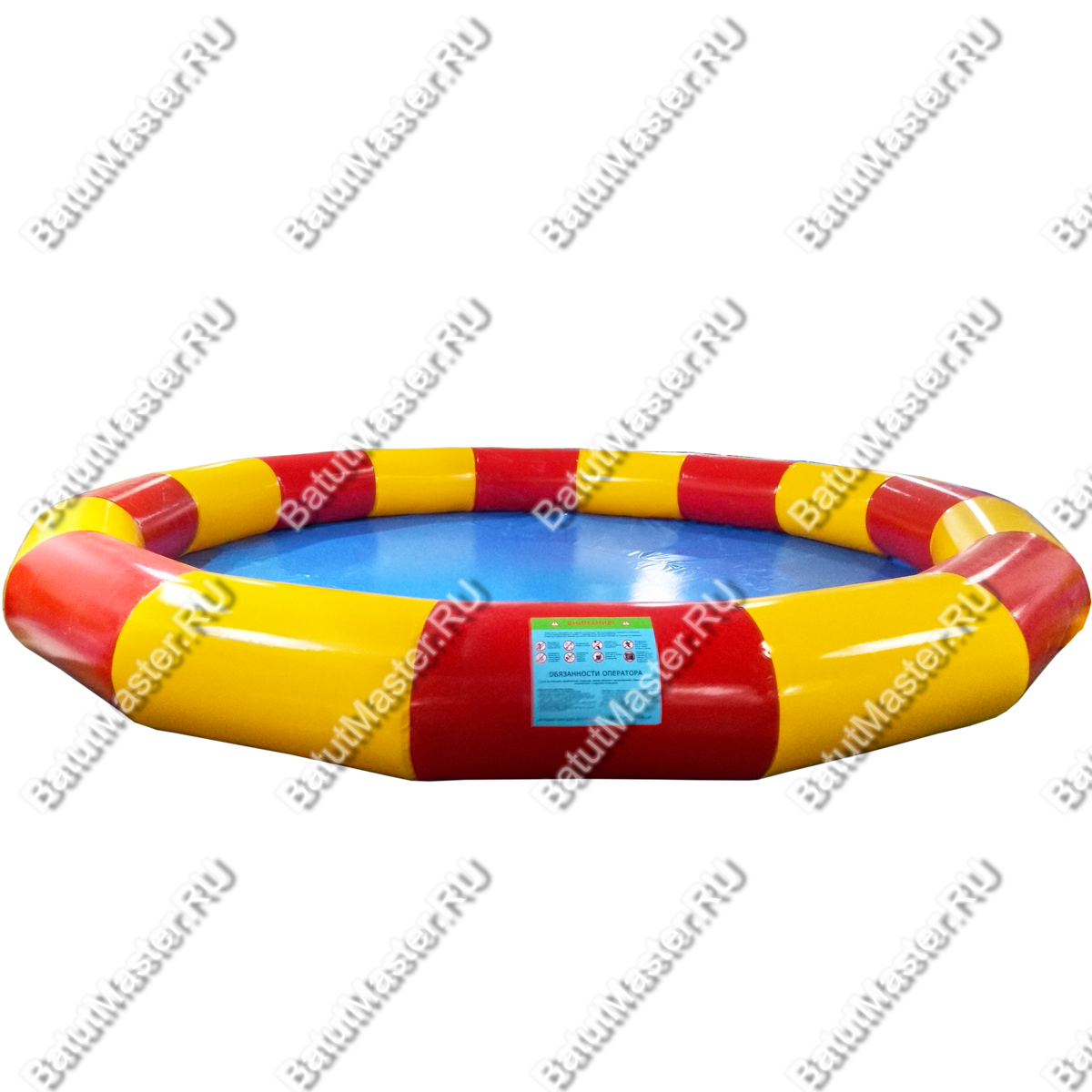 Этот бассейн выполнен из армированного непрозрачного ПВХ толщиной 0,9 мм и плотностью 1100 г/м² — один из самых прочных и надёжных материалов в индустрии надувных аттракционов. Все швы выполнены с использованием технологии сварки внахлёст (2,5 см), что обеспечивает максимальную герметичность и устойчивость к разрывам.