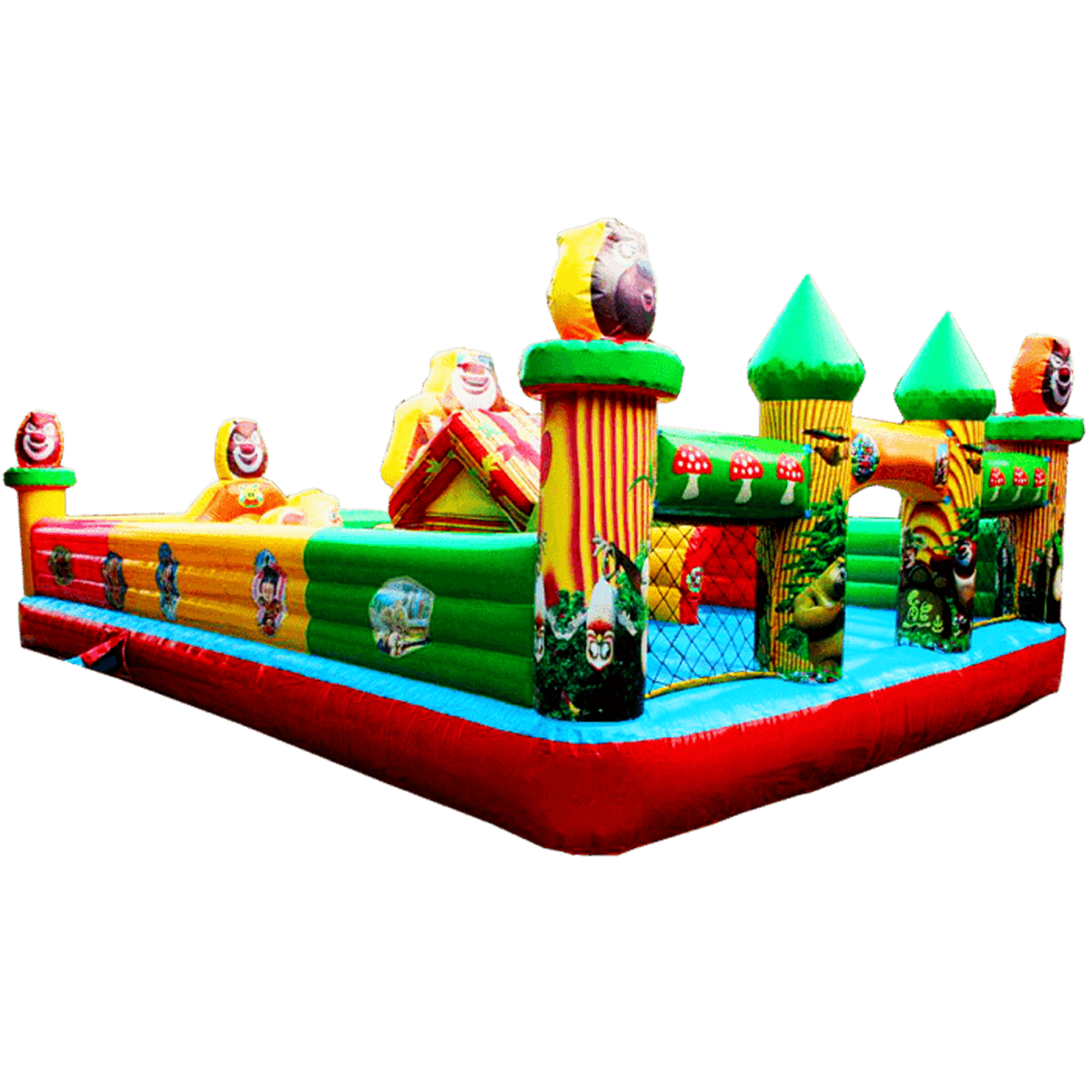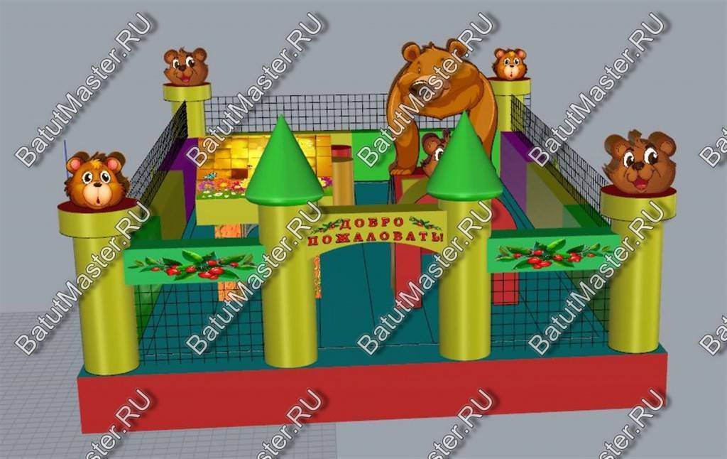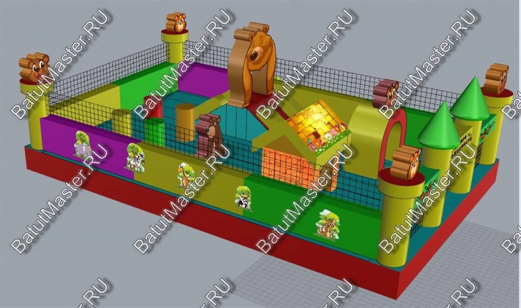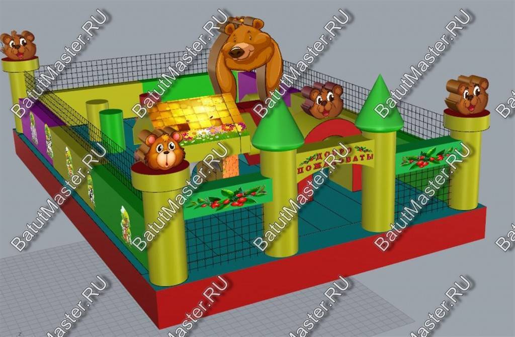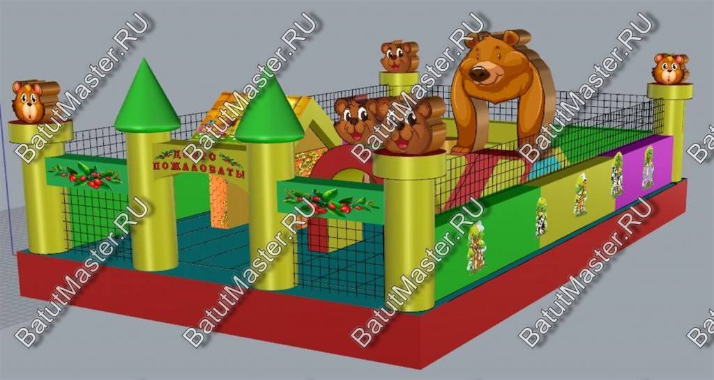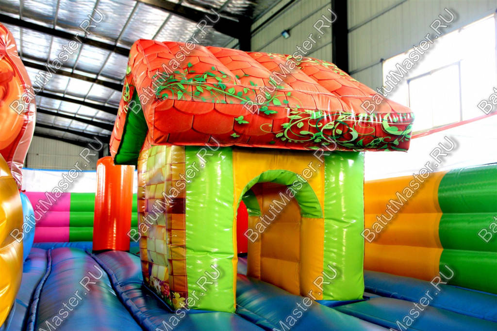 По-летнему яркий батут с множеством надувных обитателей подойдет для игр и забав самых маленьких посетителей. Сейчас даже сложно представить насколько малыш будет рад встретиться с мягкими птичками и героями из любимых мультиков. Как только ребенок войдет на площадку, его ожидает главное удовольствие этого надувного батута: уточка с открытым ртом, внутри которой поместилась небольшая горка. Все четыре стены аттракциона ограждены мягким забором из разноцветных секторов, а в каждом углу установлены опоры с головами в виде ромашек с розовыми лепестками.