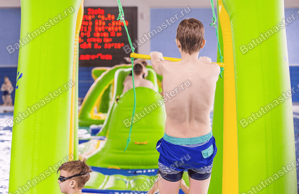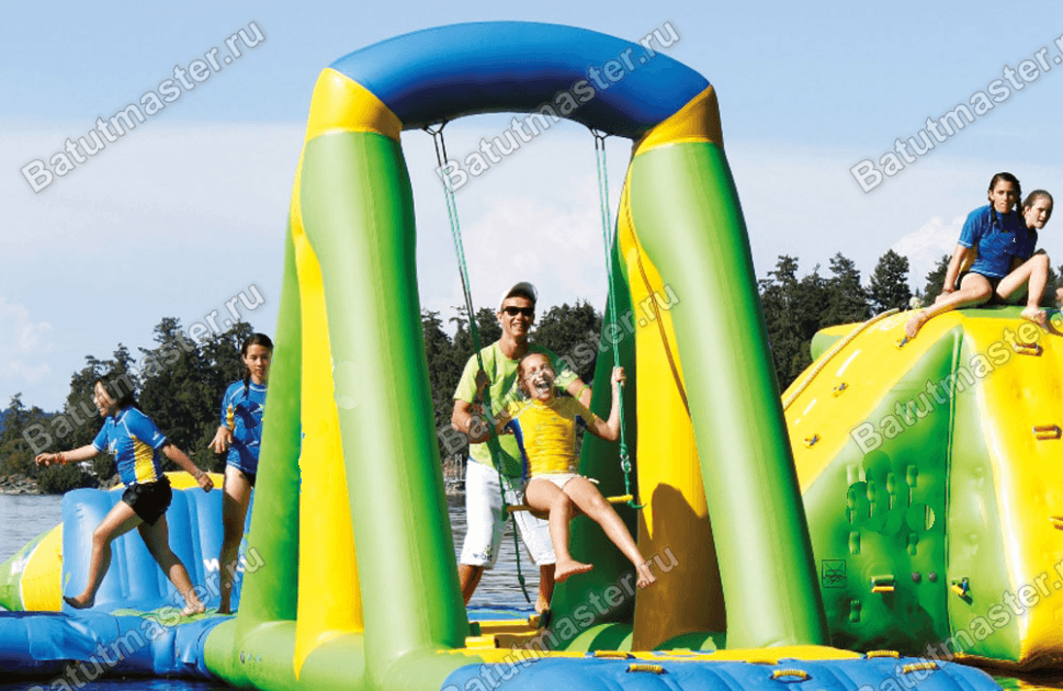 Размеры конструкции (6 м длина, 2 м ширина и 3,2 м высота) позволяют комфортно разместить её как на открытом водоёме, так и в бассейне достаточной глубины. Минимальная глубина воды – 3 м, что обеспечивает безопасность при падении и делает процесс качания максимально комфортным и захватывающим.