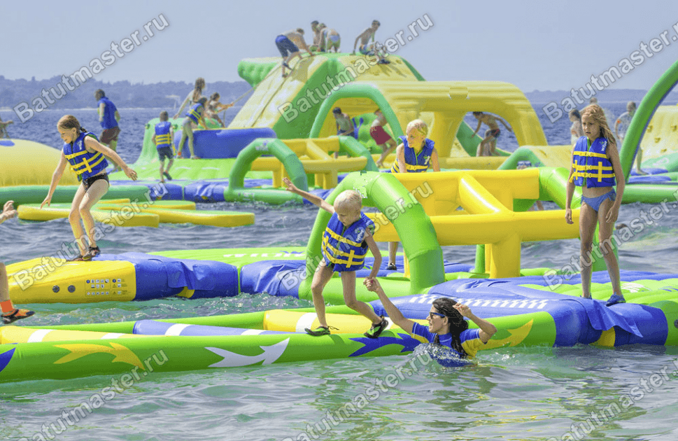 Перед эксплуатацией элемент аквапарка «Препятствие» раскладывается на ровной водной поверхности и наполняется воздухом с помощью насоса. После надувания изделие становится герметичным и готовым к использованию.