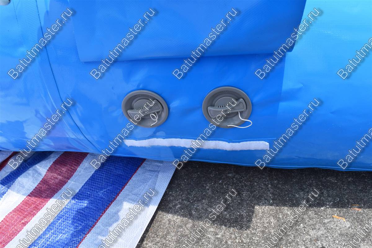- Подключите насос, вставьте рукав в клапан для надува и накачайте все элементы аквапарка.