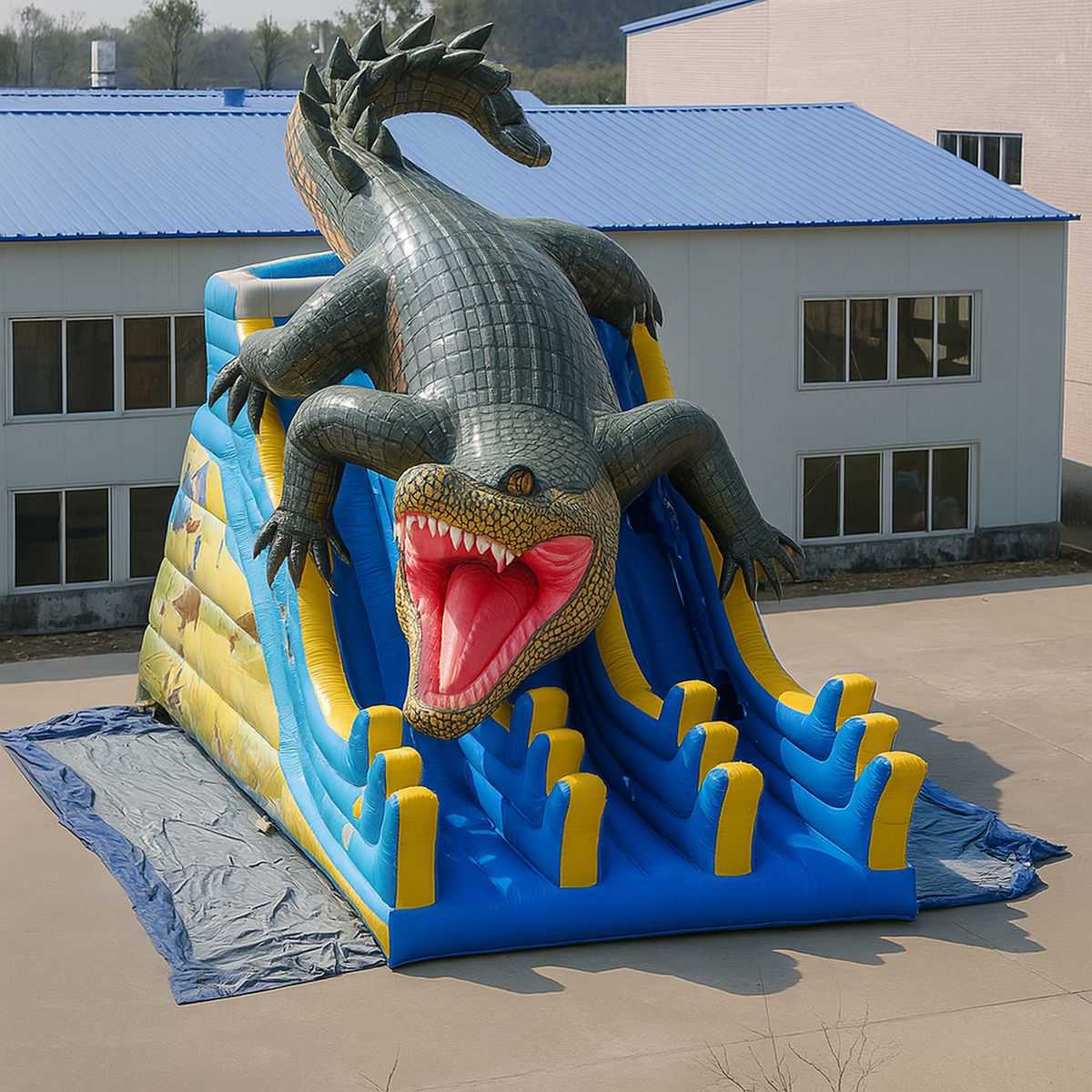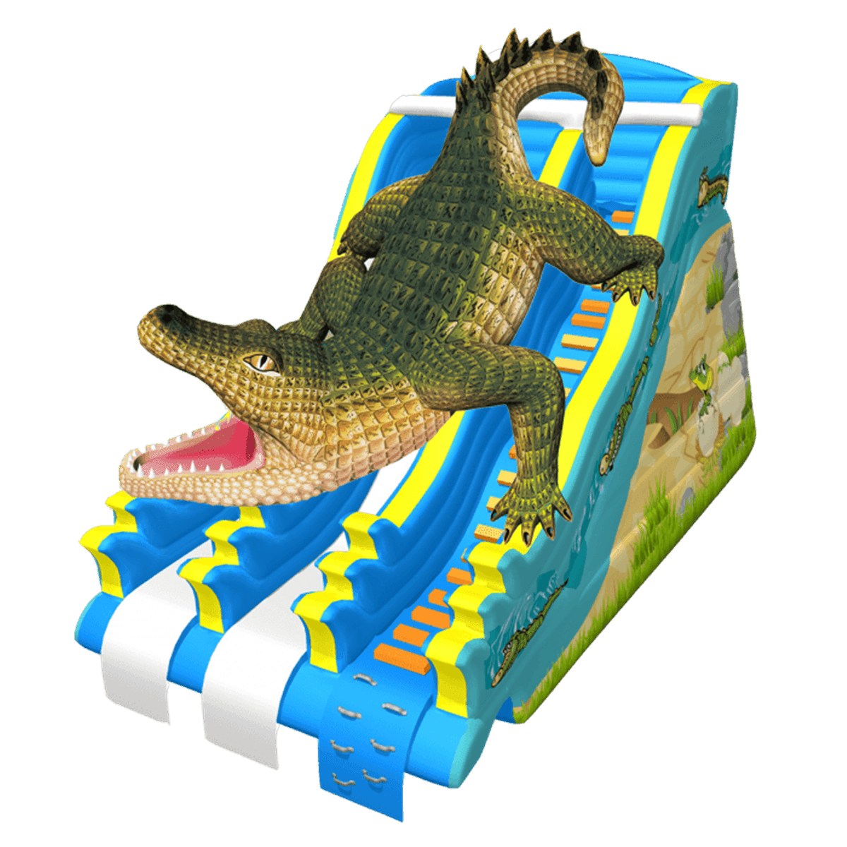Надувная водная горка «Крокодил Данди» — это полноценный аттракцион, который задаёт тон всему вашему наземному аквапарку. Она выполнена в виде огромного крокодила с впечатляющей детализацией чешуи, мощными лапами и открытой пастью, что неизменно вызывает восторг у детей и привлекает внимание прохожих издалека. Габариты 12x5x7 м позволяют разместить горку на открытой площадке или в помещении с достаточной высотой потолков. Две отдельные дорожки дают детям возможность кататься по очереди или устраивать дружеские соревнования. .