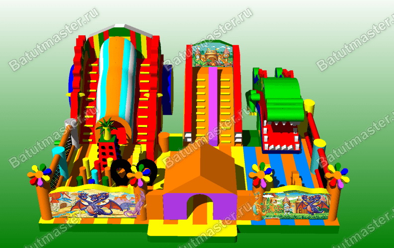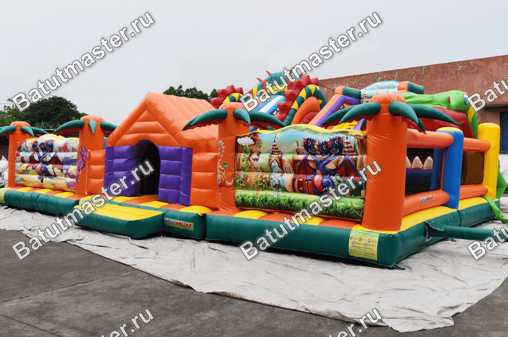 Добро пожаловать в царство драконов! Внушительных размеров игровой комплекс, выполненный в необычной тематике, где каждая локация представляет собой логово дракона. Зайдя на батут, дети почувствуют, что их ждет невероятное приключение. Здесь все напоминает о сказочных существах. С правой стороны расположен огромный надувной модуль в виде дракона с большими белыми клыками. Внутрь него детишки могут забираться, а после скатываться с горки. А сколько здесь подъемов и спусков…веселиться можно бесконечно всей командой. С левой стороны находится скалодром и надувные столбцы сквозь которые так любят пробираться дети.