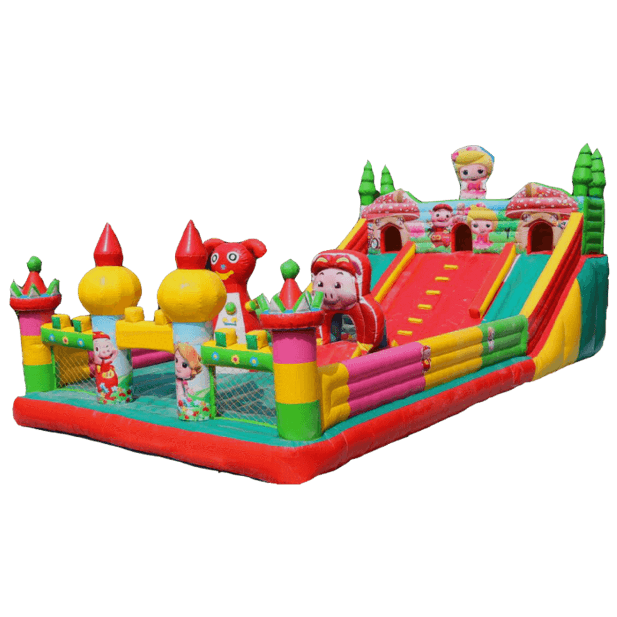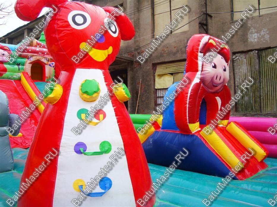 Задняя стенка выделяется из всех тем, что она оборудована высоким спуском на всю ширину аттракциона. Верхняя часть батута-горки выглядит, как закрытый длинный домик с небольшими арками. Как раз из них можно спуститься вниз (через правую и левую), а через центральную легко взобраться наверх, так как там установлена лестница из красного ПВХ с желтыми ступеньками. Весь аттракцион поддерживает дух поучительной истории про маленьких и глупых поросят, поэтому у детей обязательно возникнет желание проиграть эту сказку и вообразить себя в роли главных героев.