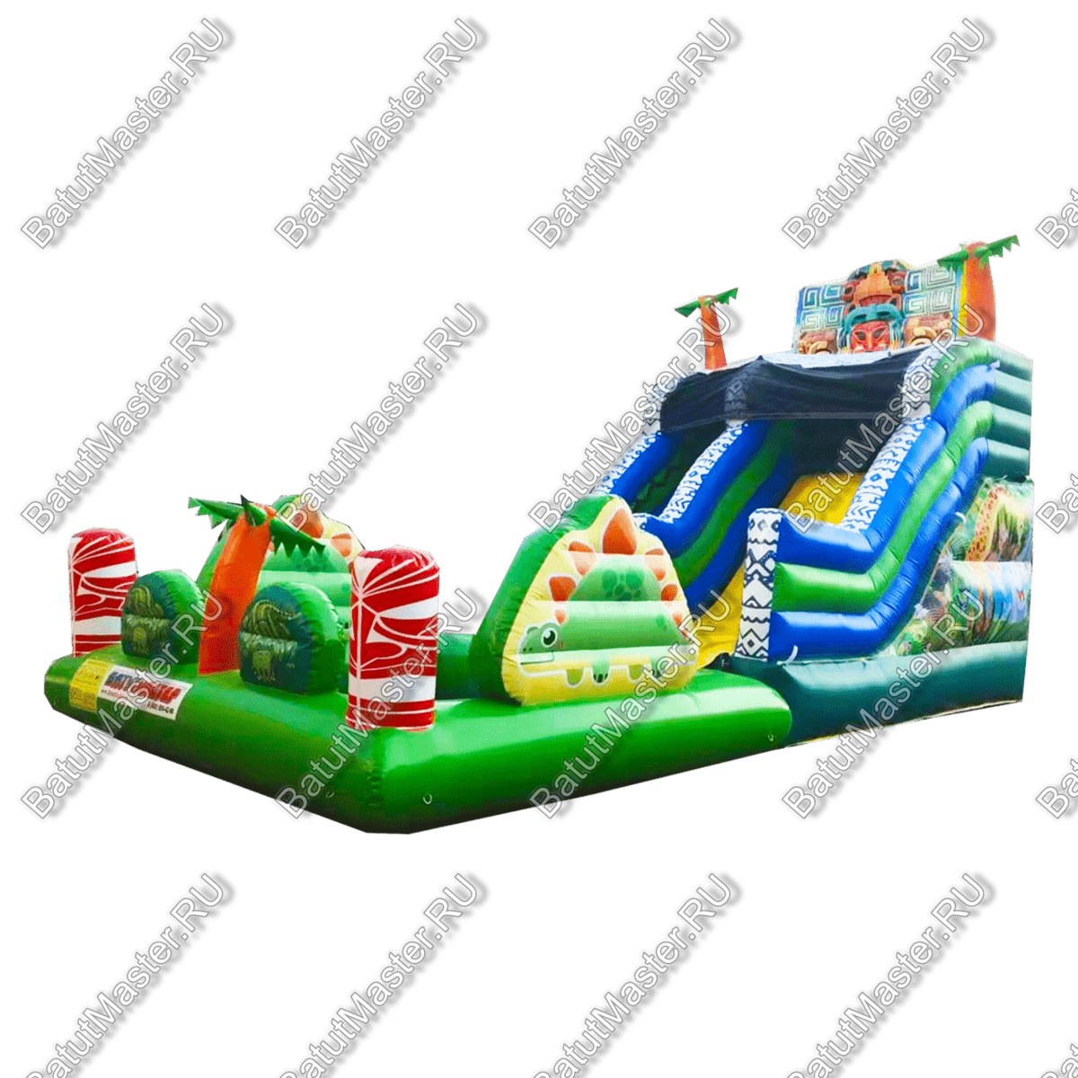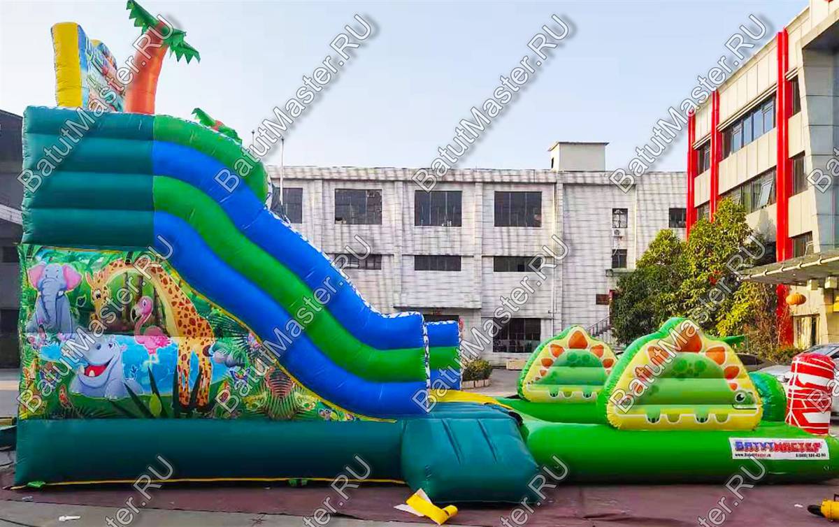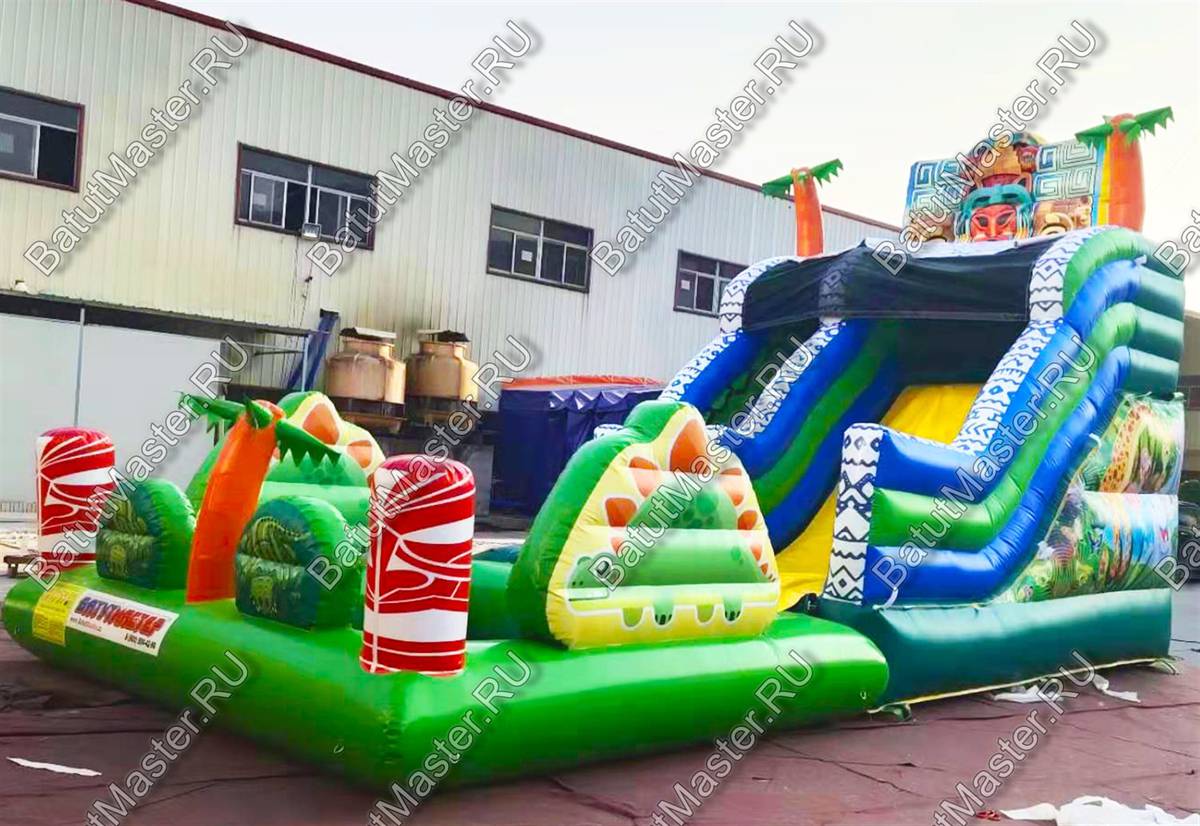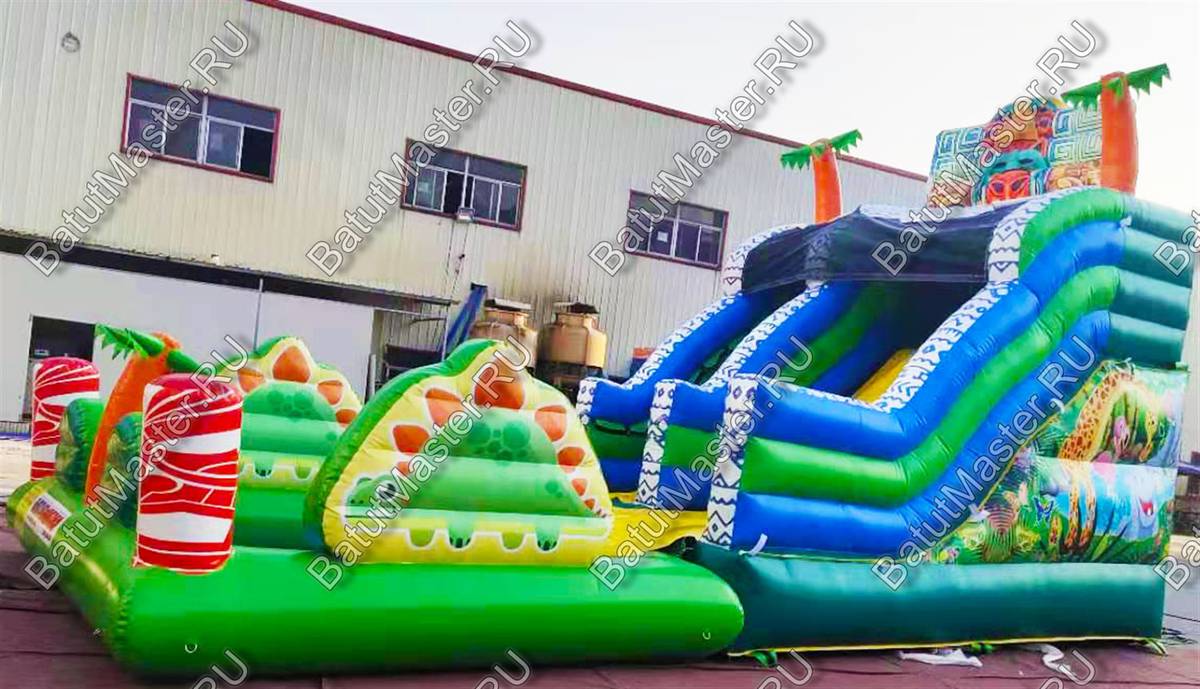 Яркий батут, будто сошедший из экранов компьютеров, а, точнее, вышедший из популярной игры Зумма. Все его части и элементы полностью совпадают с изображениями в игре. Уличный батут с внешней стороны пошит из зеленого ПВХ, на этой поверхности изображены крокодилы, попугаи и южная растительность. Горка с подъемом сшиты из синего материала, а самый верх украшен пальмами и большой подушкой с изображением зуммы.