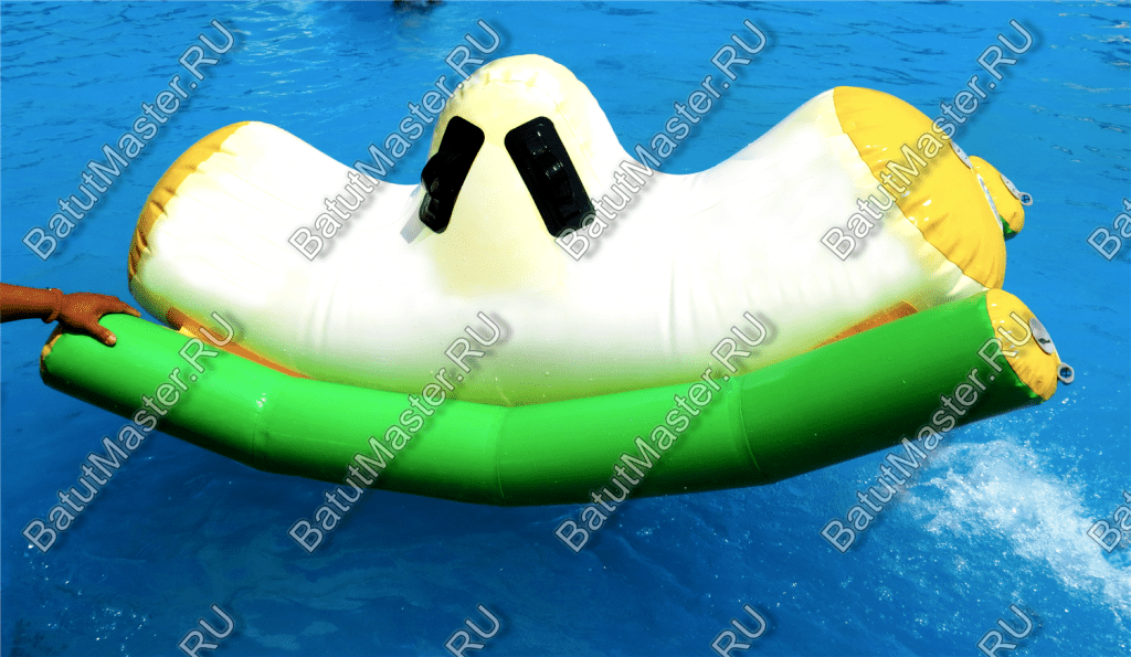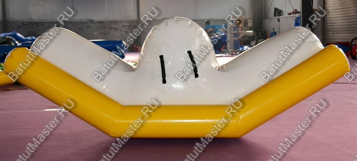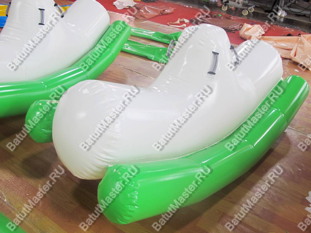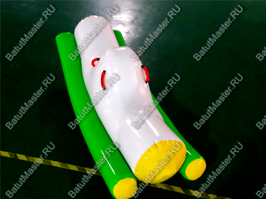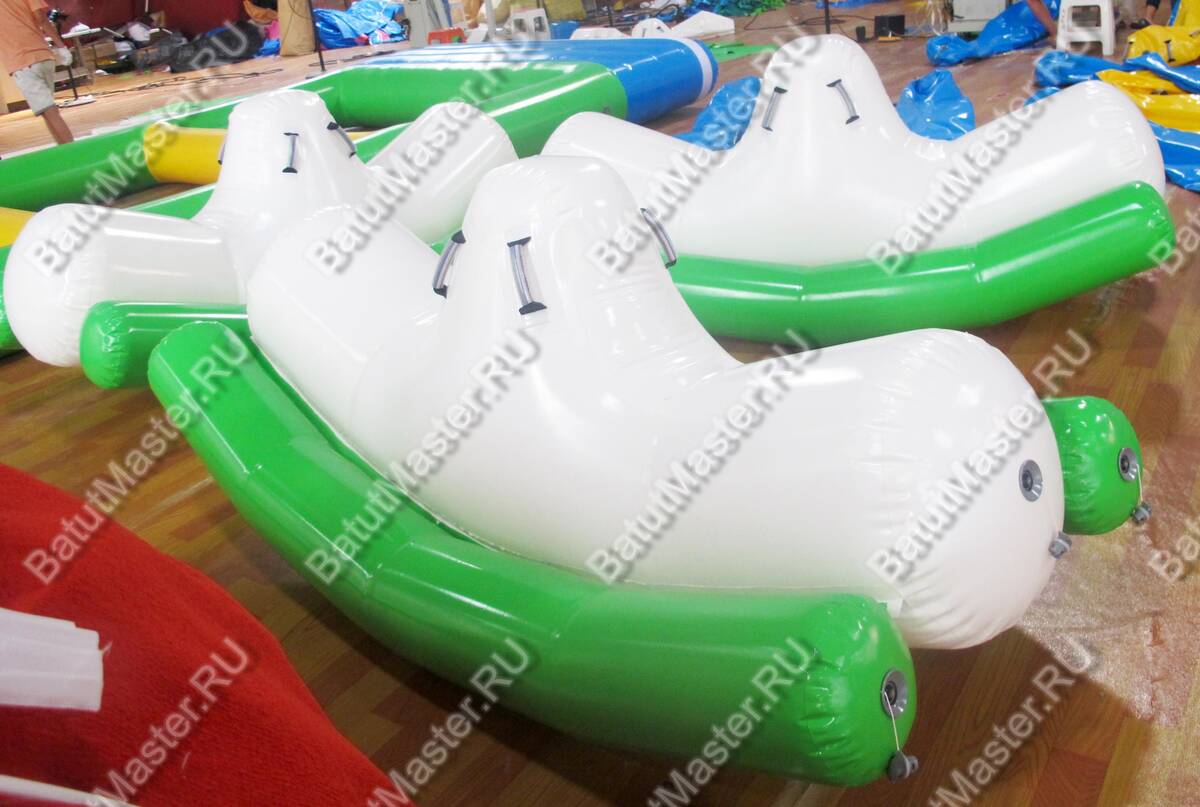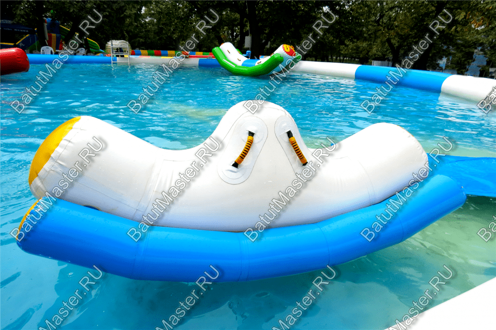 Элемент «Малая качеля» — это миниатюрная версия популярного водного аттракциона, адаптированная для детских аквапарков и зон с неглубокой водой. Она представляет собой надувную конструкцию с двумя зелёными опорными баллонами и белой центральной платформой. Дети садятся по краям и начинают раскачивать элемент, создавая эффект лёгкого водного маятника.