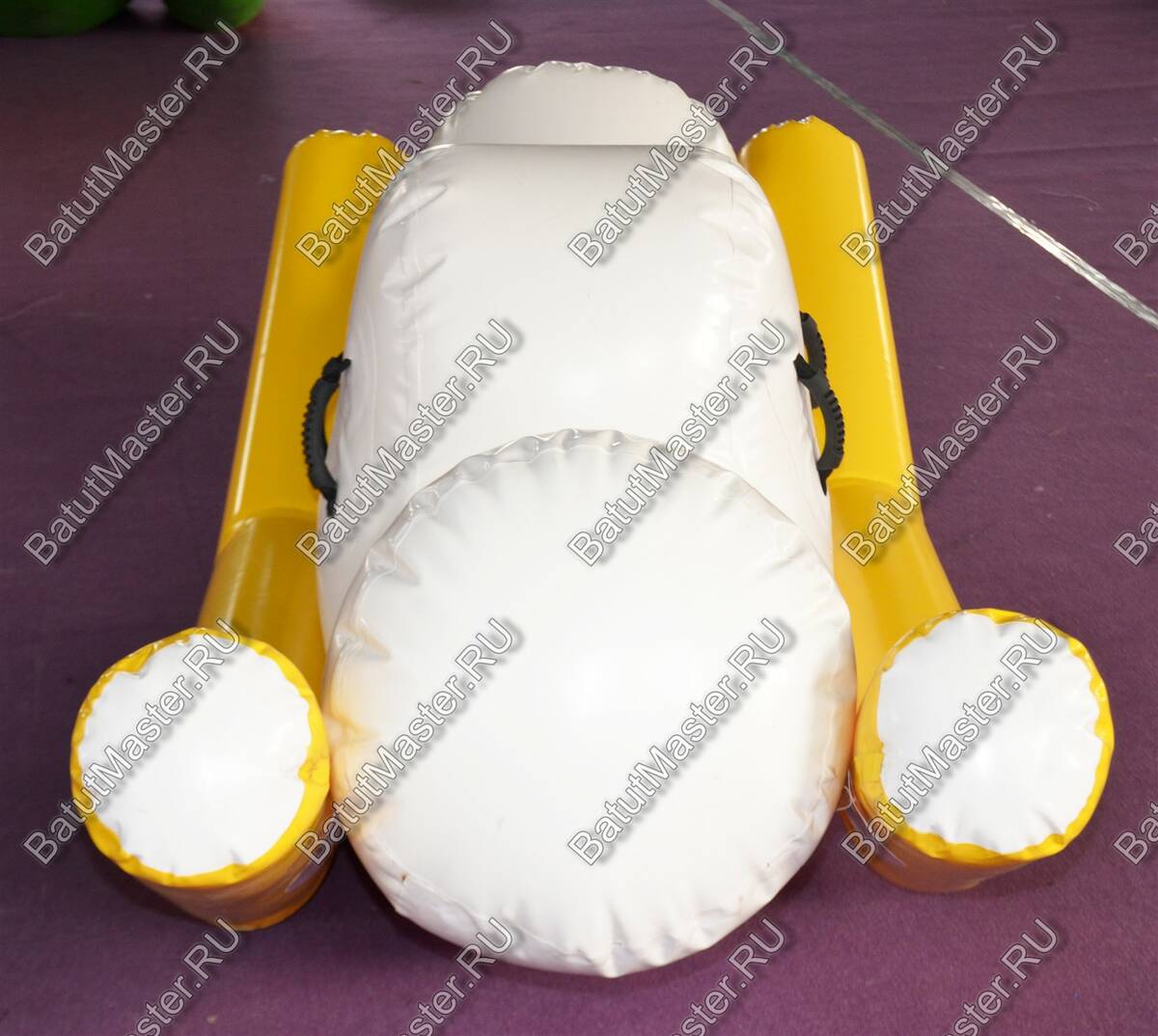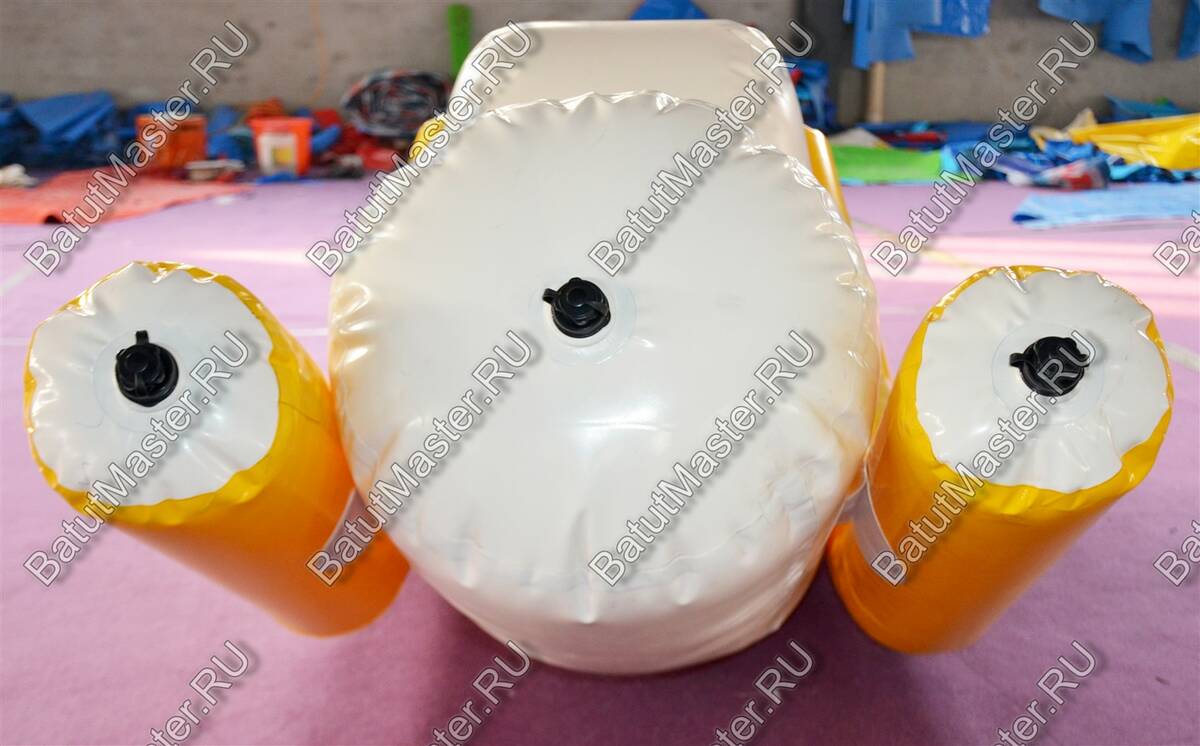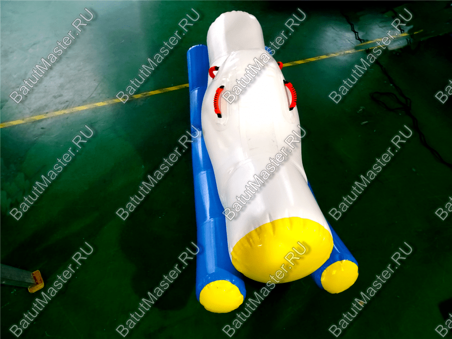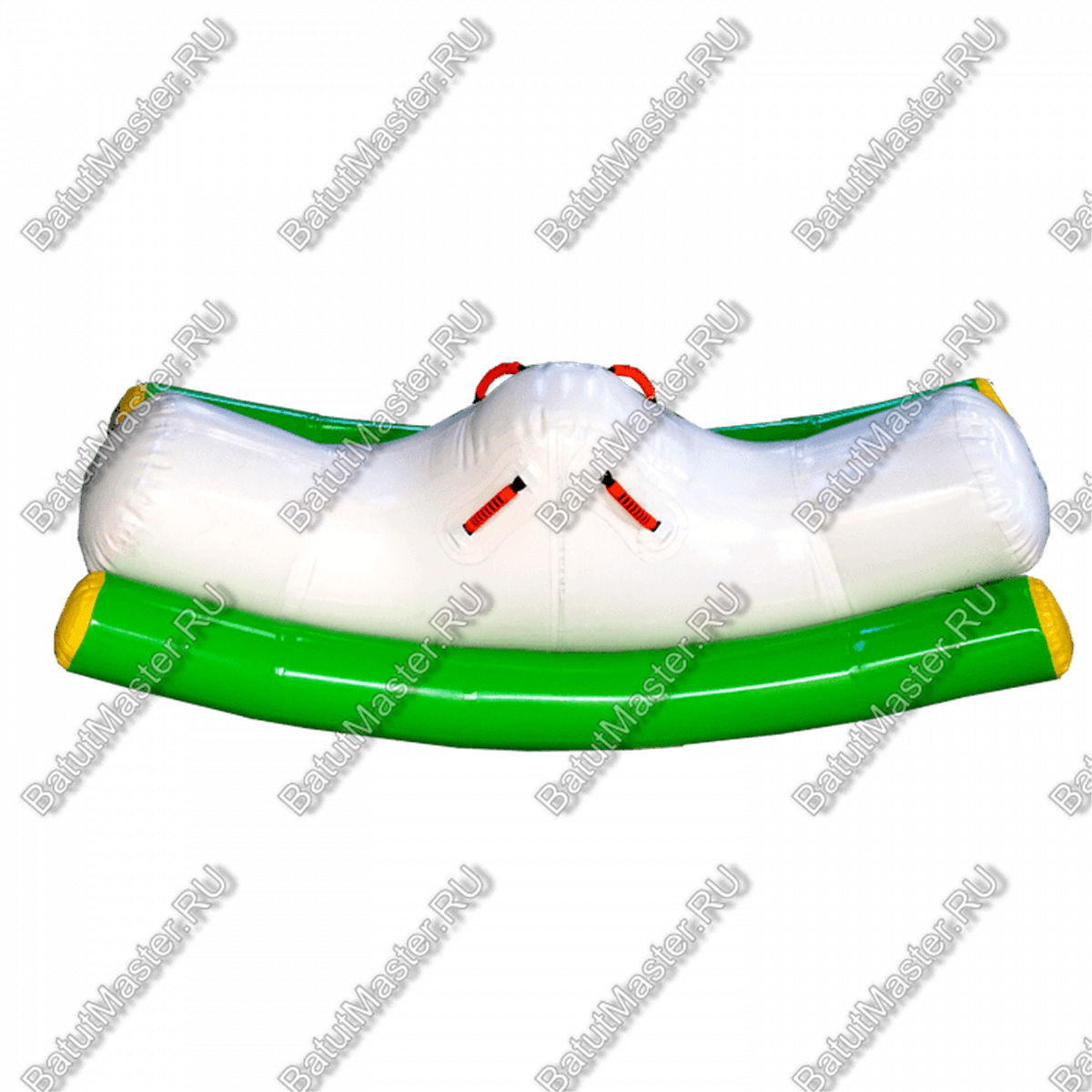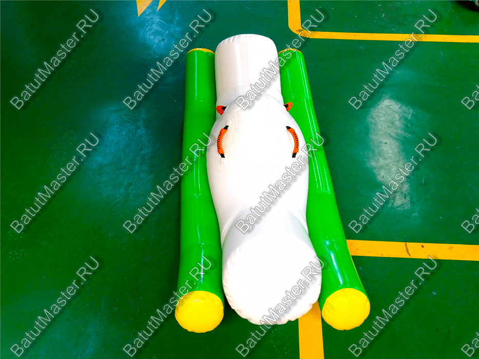 Элемент «Малая качеля» — это миниатюрная версия популярного водного аттракциона, адаптированная для детских аквапарков и зон с неглубокой водой. Она представляет собой надувную конструкцию с двумя зелёными опорными баллонами и белой центральной платформой. Дети садятся по краям и начинают раскачивать элемент, создавая эффект лёгкого водного маятника.