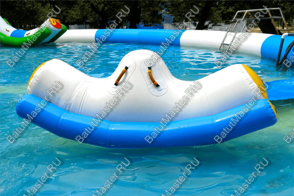 Элемент аквапарка «Малая качеля» изготовлен из усиленного армированного ПВХ высокой плотности (1100 г/м²). Материал отличается повышенной прочностью, устойчив к солнцу, солёной и пресной воде, а также сохраняет эластичность при изменении температуры. Элемент надувается насосом один раз, после чего сохраняет форму без необходимости подкачки. Посредине качели по бокам расположены удобные ручки для удержания во время раскачивания.