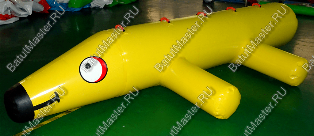 Элемент аквапарка «Жёлтая такса» представляет собой удлинённый надувной модуль с забавной мордочкой и характерным «телосложением» этой породы.