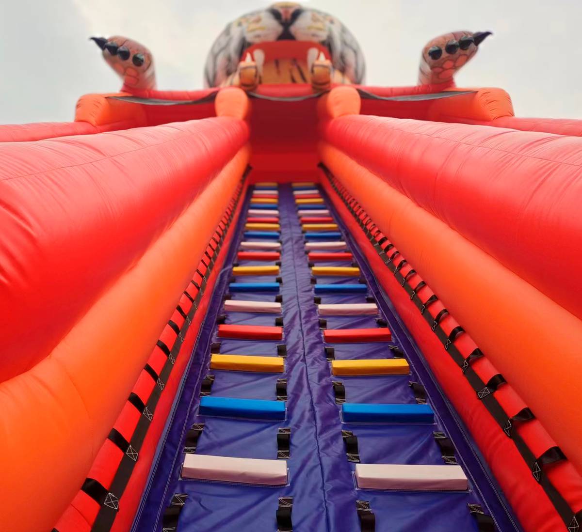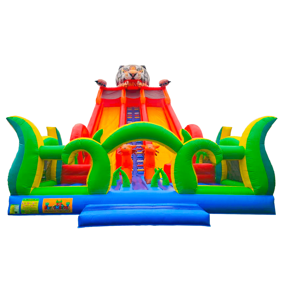 Коммерческий надувной батут «Большой тигр» сочетает в себе все плюсы классической горки, но при этом может порадовать маленьких посетителей красочным декором и яркими красками.