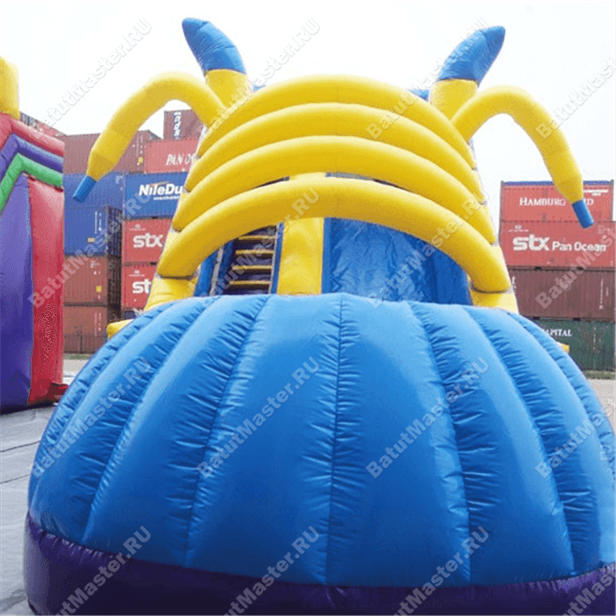 Функционально коммерческий батут представляет собой горку с высотой стартовой площадки 3 м. Между передней частью ботинка и его боковыми сторонами находятся проемы, через которые дети попадают наверх. Зона горки делится на 2 части: слева проходит лестница, а справа – широкая горка. Между лестницей и полотном спуска есть разграничительный надувной барьер с ярко желтым кантом. Лестница оборудована ленточными перилами, поэтому подниматься стало еще удобней. Стартовая площадка вверху закрыта с трех сторон, задняя стенка оборудована прозрачным окном.