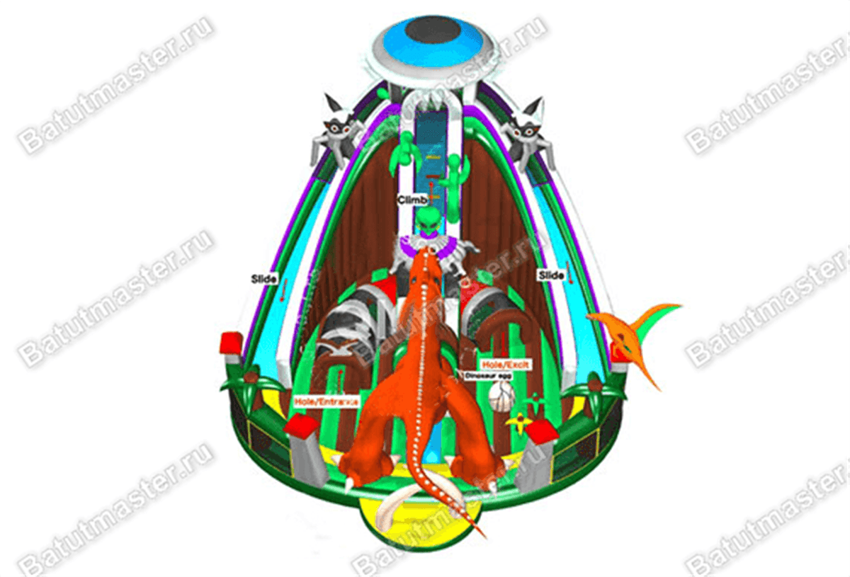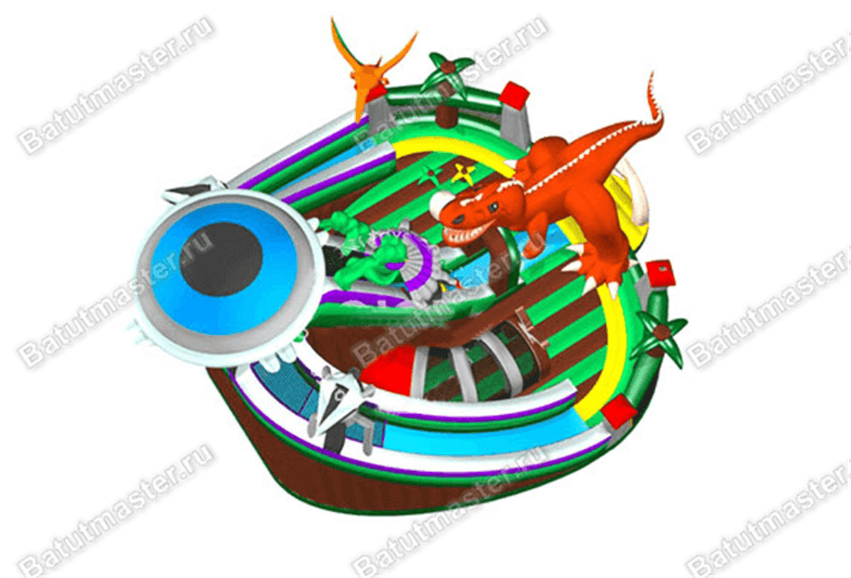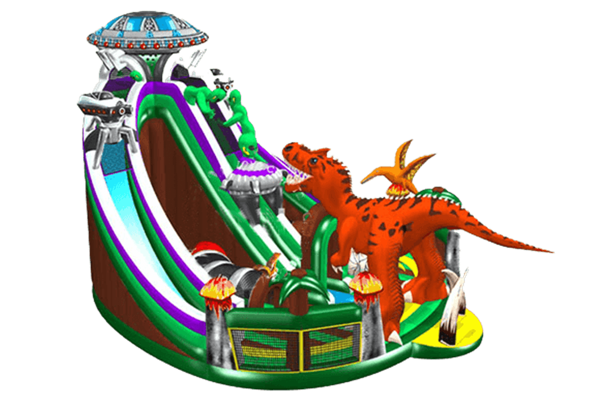 Сочетание самого интересного доисторического животного и то, что загранично нашей реальности обязательно вызовет максимальное внимание посетителей и такой же высокий уровень дохода у владельца яркого батута. Конструкция насчитывает в себе множество декоративных фигур, в которых можно разглядеть инопланетян или марсианинов, огромного оранжевого динозавра и даже роботов. Самым главным украшением на самом верху аттракциона является почти настоящая летающая тарелка.