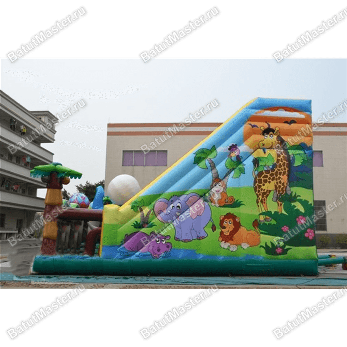 Аттракцион с самым любимым детским животным обязательно привлечет внимание каждого малыша своим добрым и огромным взглядом, ведь в самом центре надувной площадке разместился огромный слоненок с забавными и глазами и открытым розовым ртом. С обеих сторон от него проходит подъем и спуск. А между ними образовывается площадка с яркими картинками, на которых изображены самые интересные животные Африки. В фасадной стороны яркий батут окружен надувным ограждением в виде экзотической зеленой растительности из ПВХ, по углам стоят пальмы, а на вход длинные грибочки.