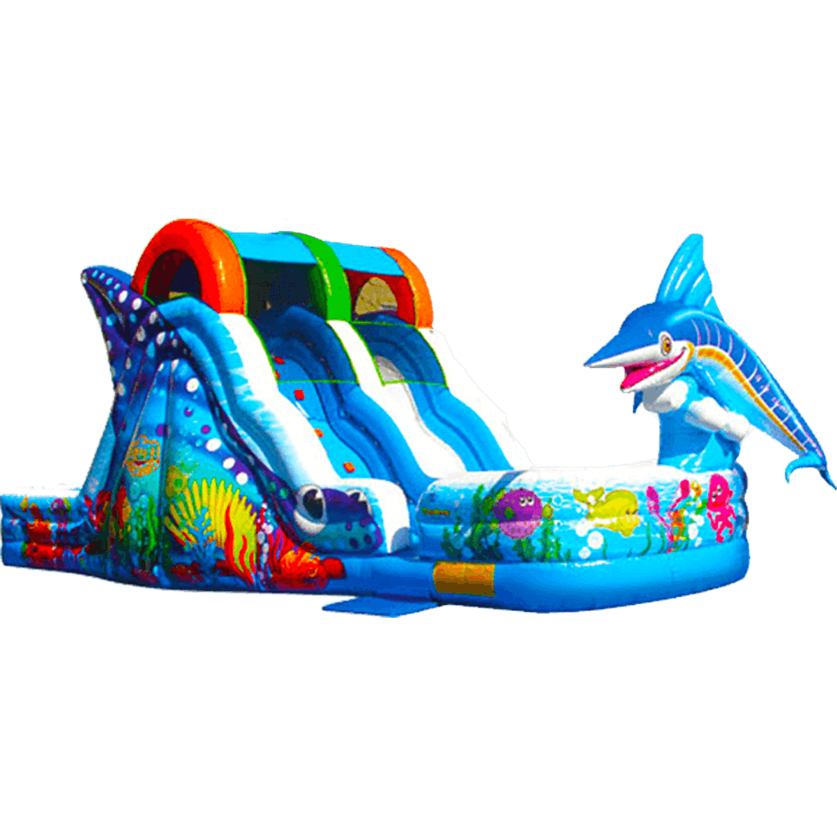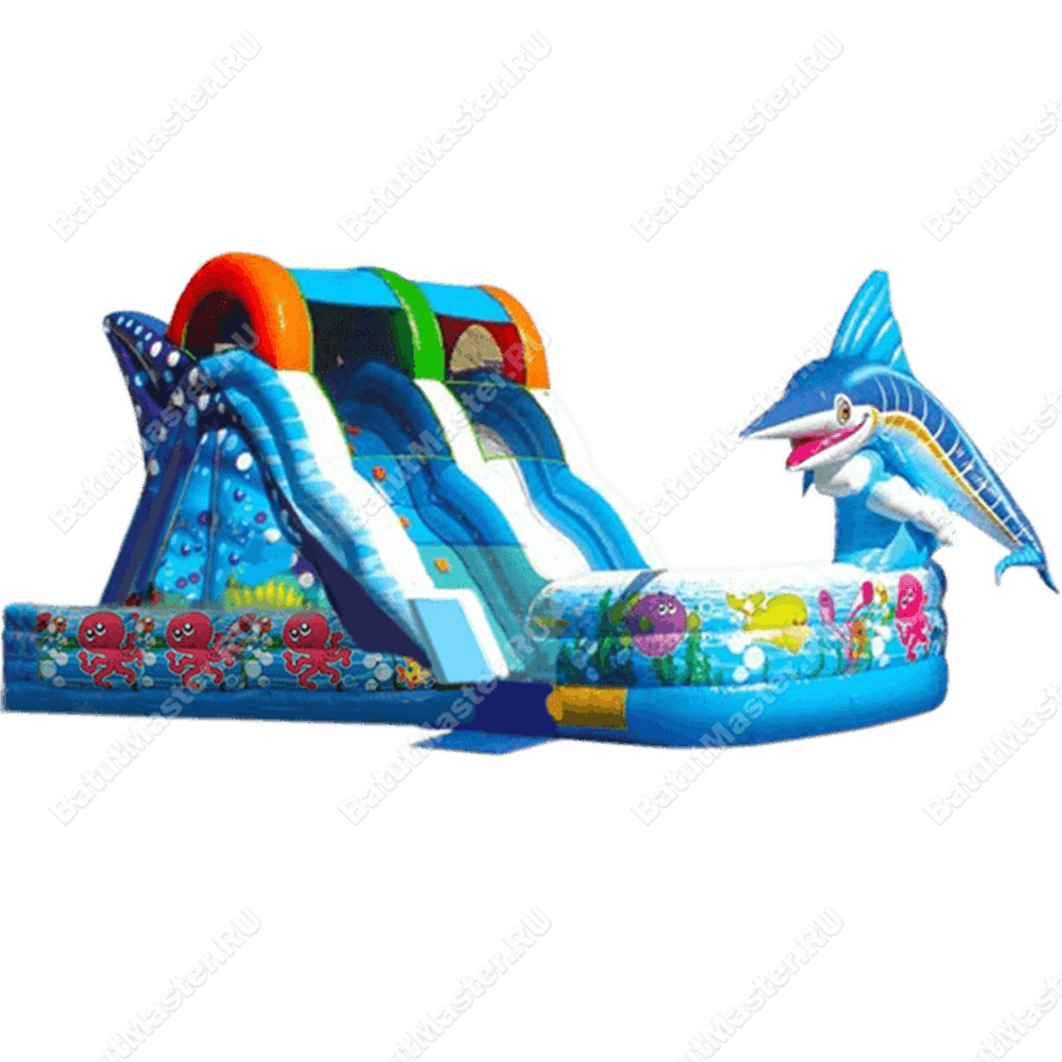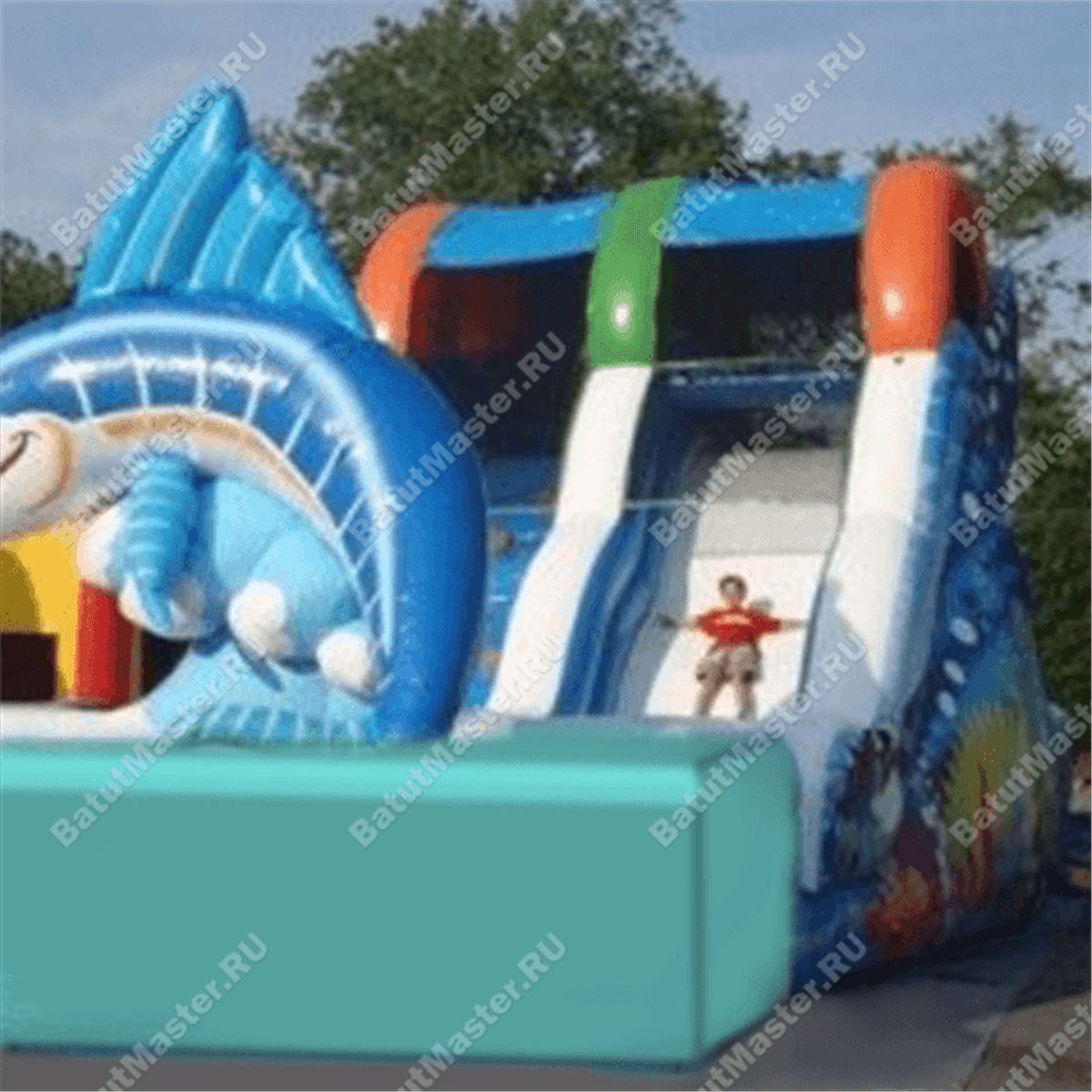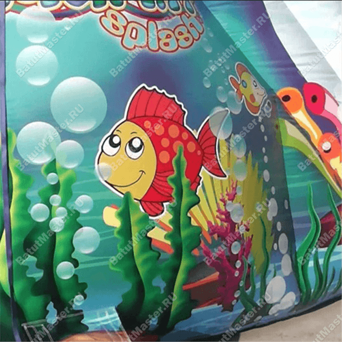 Общее впечатление: надувной батут в морской тематике, где на фронтальной части располагается большая надувная фигура рыбы, будто она выпрыгнула из воды, улыбается и зазывает всех любителей поплавать к ней на веселые спуски и прыжки. Ниже горки есть общая зона для прыжков, и других развлечений, где обязательно поместиться сразу несколько детей, при этом, даже младшего возраста. По всем внешним стенкам расположились яркие изображения сказочных рыбок, водорослей и осьминогов, чтобы у малыша возникло ощущение морской пучины.