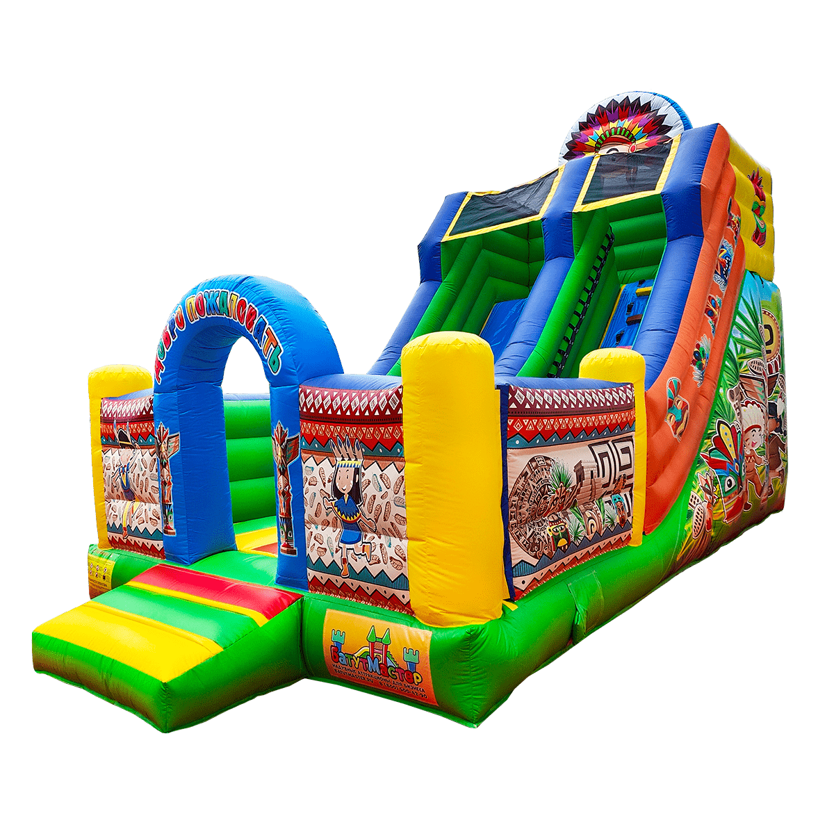 Тематика дизайна – индейцы. Стенки стилизованы изображениями вождей в традиционных головных уборах из перьев, присутствуют индейские орнаменты. Основные цвета надувной горки – синий, зеленый, желтый. В конструкцию включены следующие развлекательные элементы: