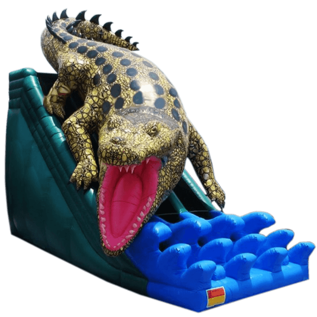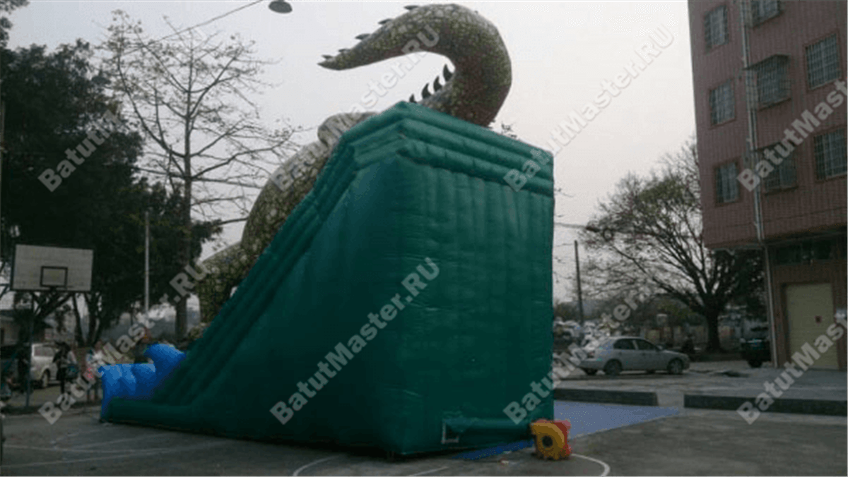 Такой большой батут приметен даже издалека - самая высокая стенка с внешней стороны полностью зеленая. С фронтального плана состоит из двух крутых спусков такого же цвета, как и его внешняя сторона, между ними проложена лестница. Лишь у подножия аттракциона каждая высокая горка оборудована надувными синими водорослями, которые помогают ребенку задержаться после проката и не оказаться на земле. Это достаточно большой батут, где главная достопримечательность – громадный крокодил с натуральным окрасом, но надувной.