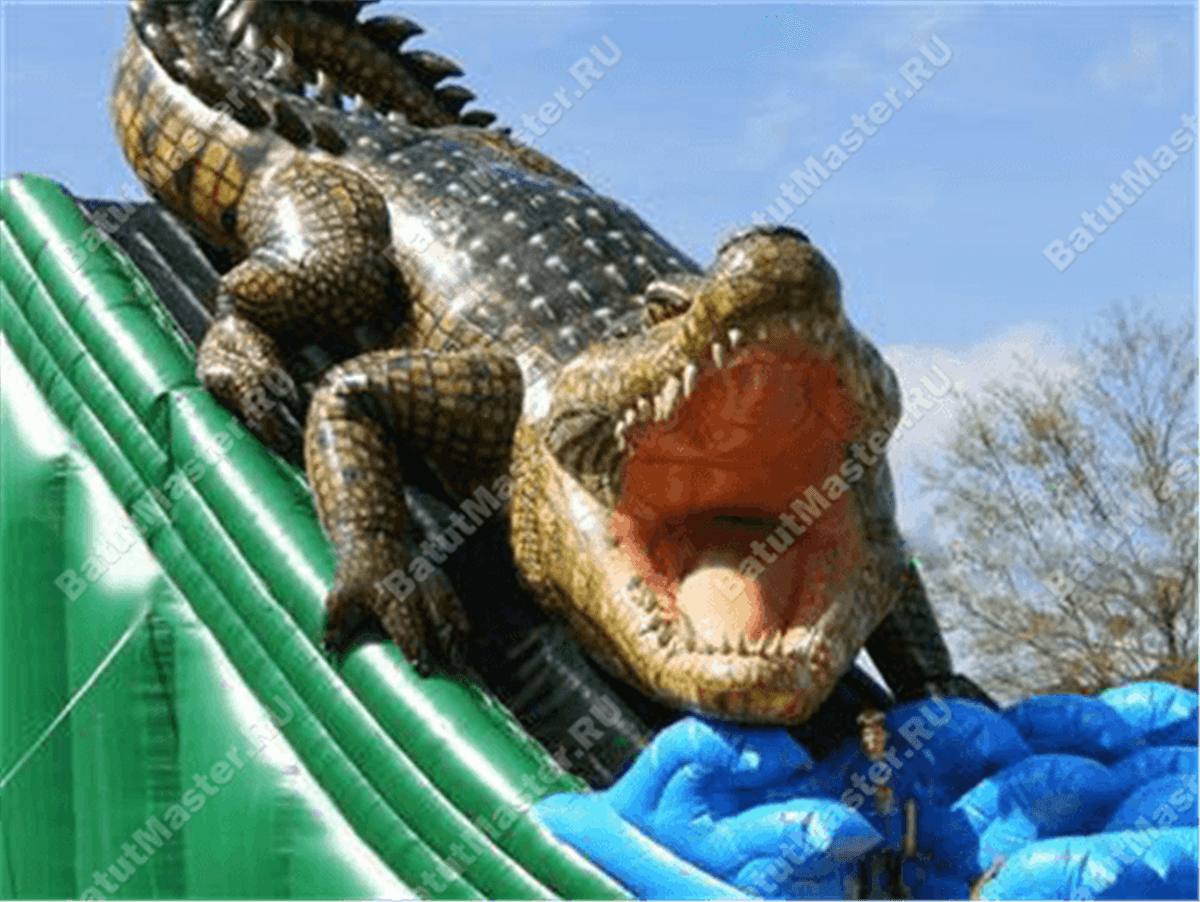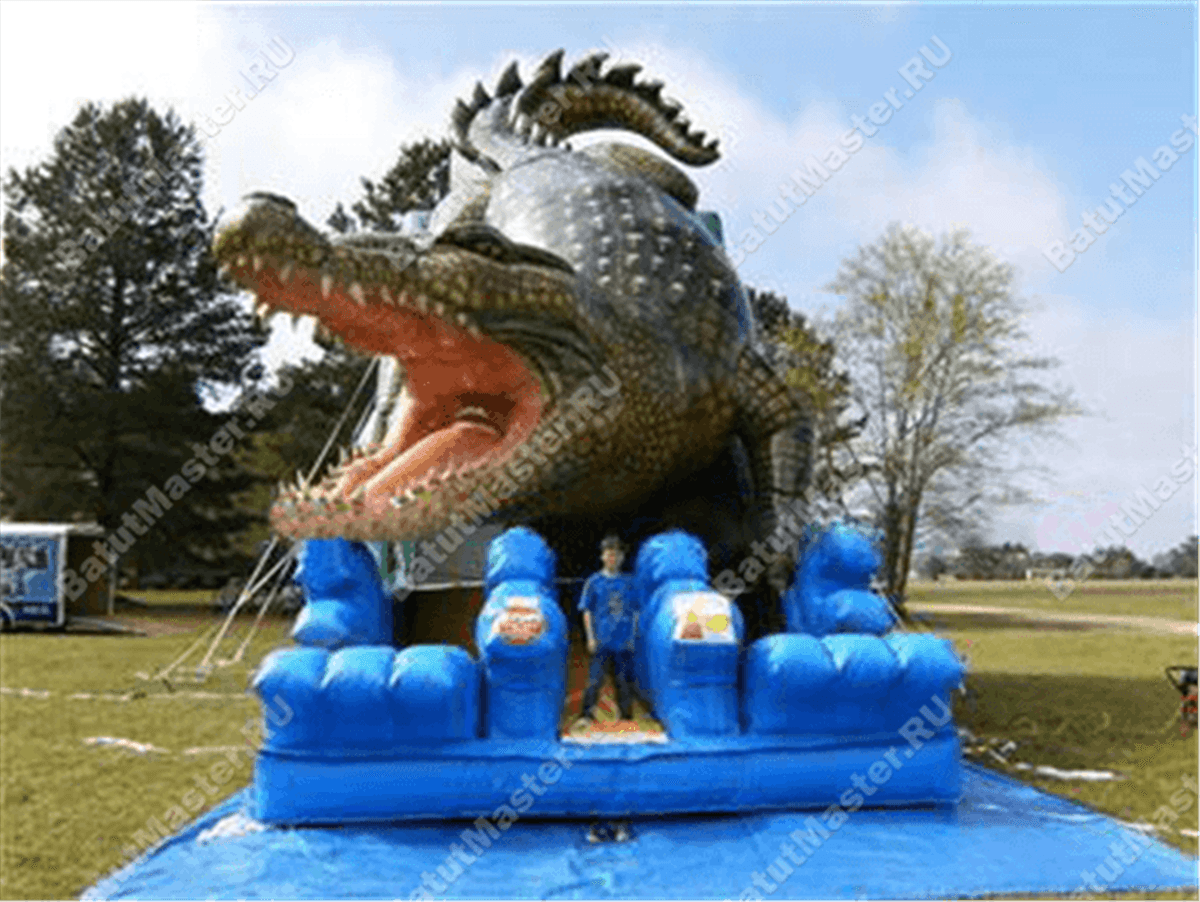 Эффектный батут с надувным и максимально приближенным к действительности крокодилом. Огромный надувной крокодил разместился по всему аттракциона, точнее, сверху над горками. Лучше охранника для ваших детей и не сыскать! Мягкий и с открытой пастью он привлекает внимание даже у взрослых. Мимо него без оглядки не проходит ни кто, а для детей лучше и страшнее развлечения даже не придумаешь!
