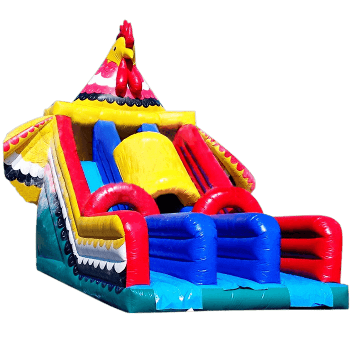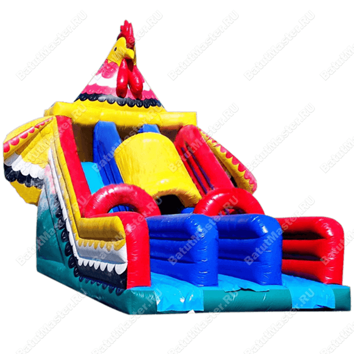 Надувная горка «Курочка Ряба» - это высокий яркий и красочный аттракцион. Батут оформлен в тройной цветовой гамме, это красно-сине-желтый комплекс, привлекающий к себе внимание издалека.