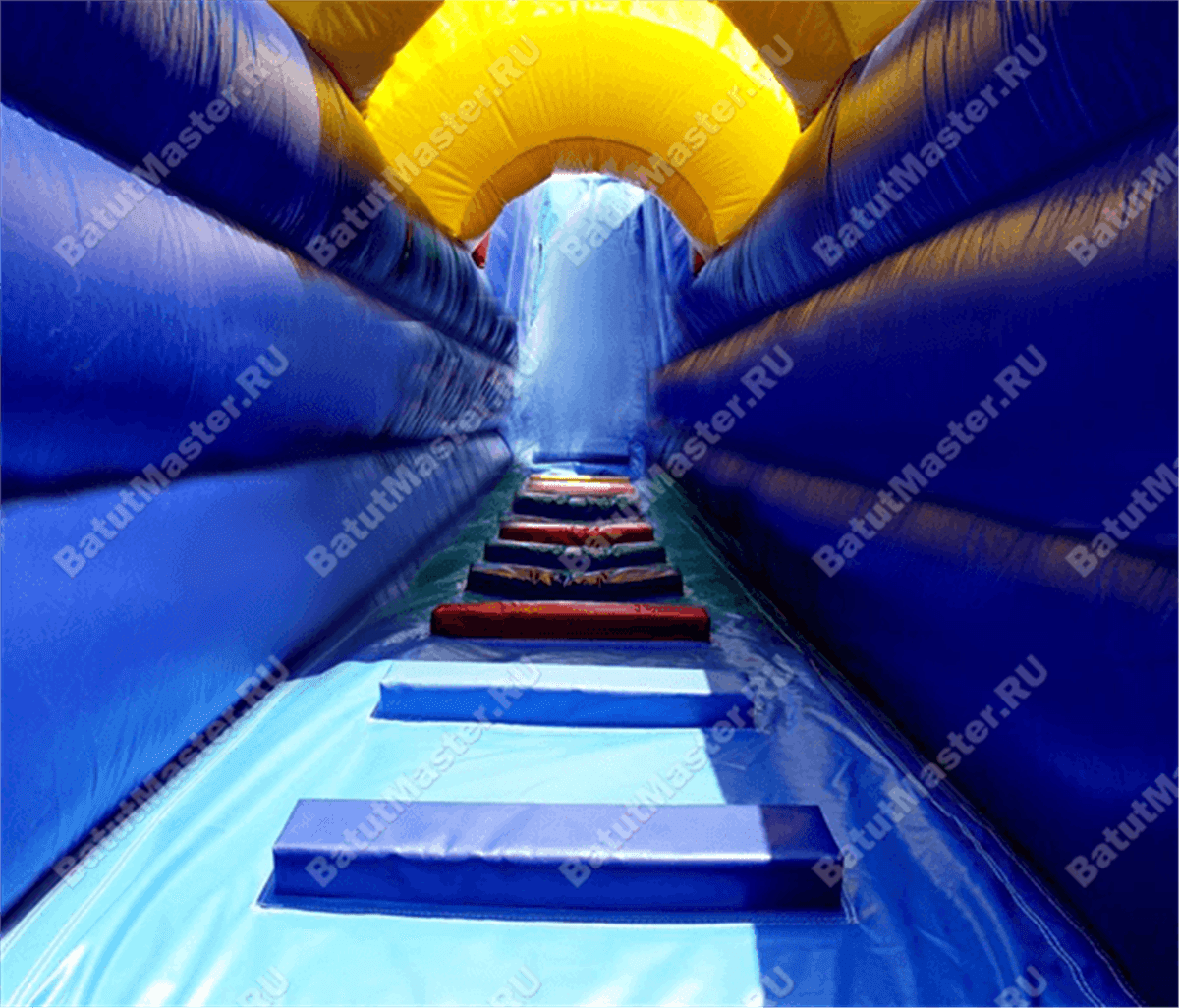 Выход к лестнице находится по центру, сами лестничные ступени закрыты сверху навесным куполом ярко желтого цвета. Боковые полосы предназначены для спуска с высоты, переход с уклонной на горизонтальную плоскость разделен навесной аркой. Прямая полоса достаточно длинная для торможения даже при сильном разгоне, что обеспечивает безопасный спуск.