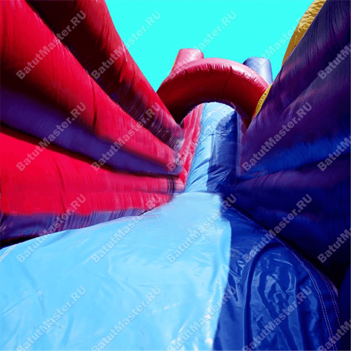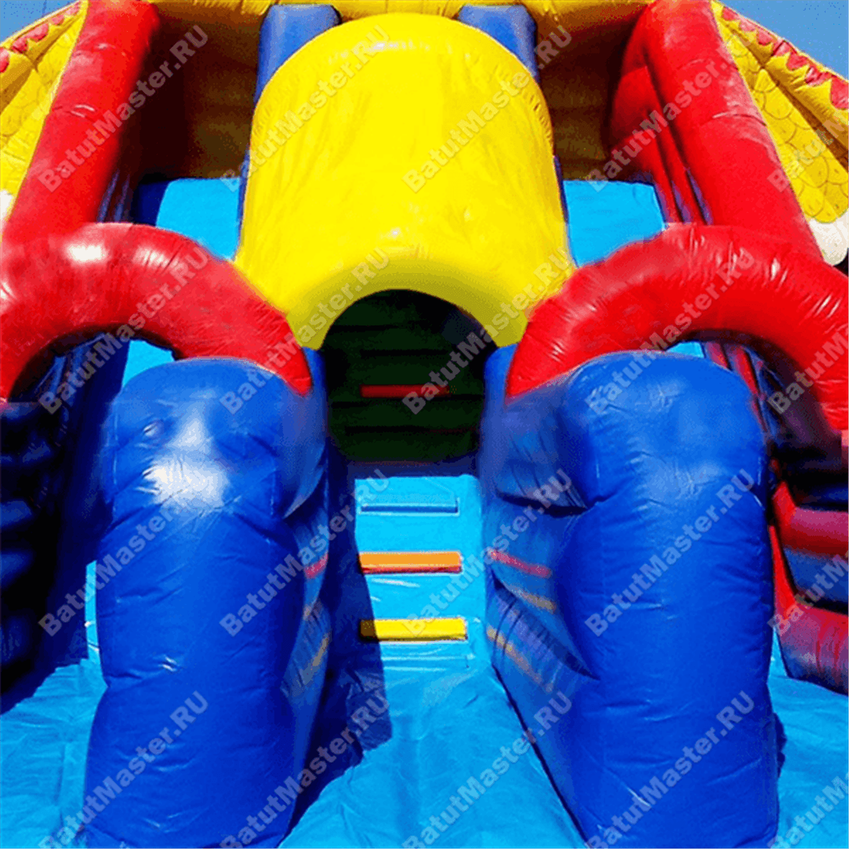 Верх аттракциона венчает фигурка сказочной курочки, она обнимает батут своими крыльями. Комплекс разделен на три полосы от самого начала и до конца верхней площадки. Каждая полоса высокой горки ограничена высокими бортами, чтобы посетителям было удобно кататься.