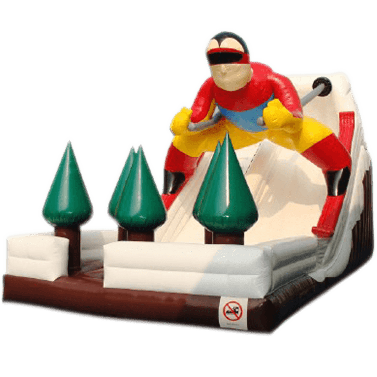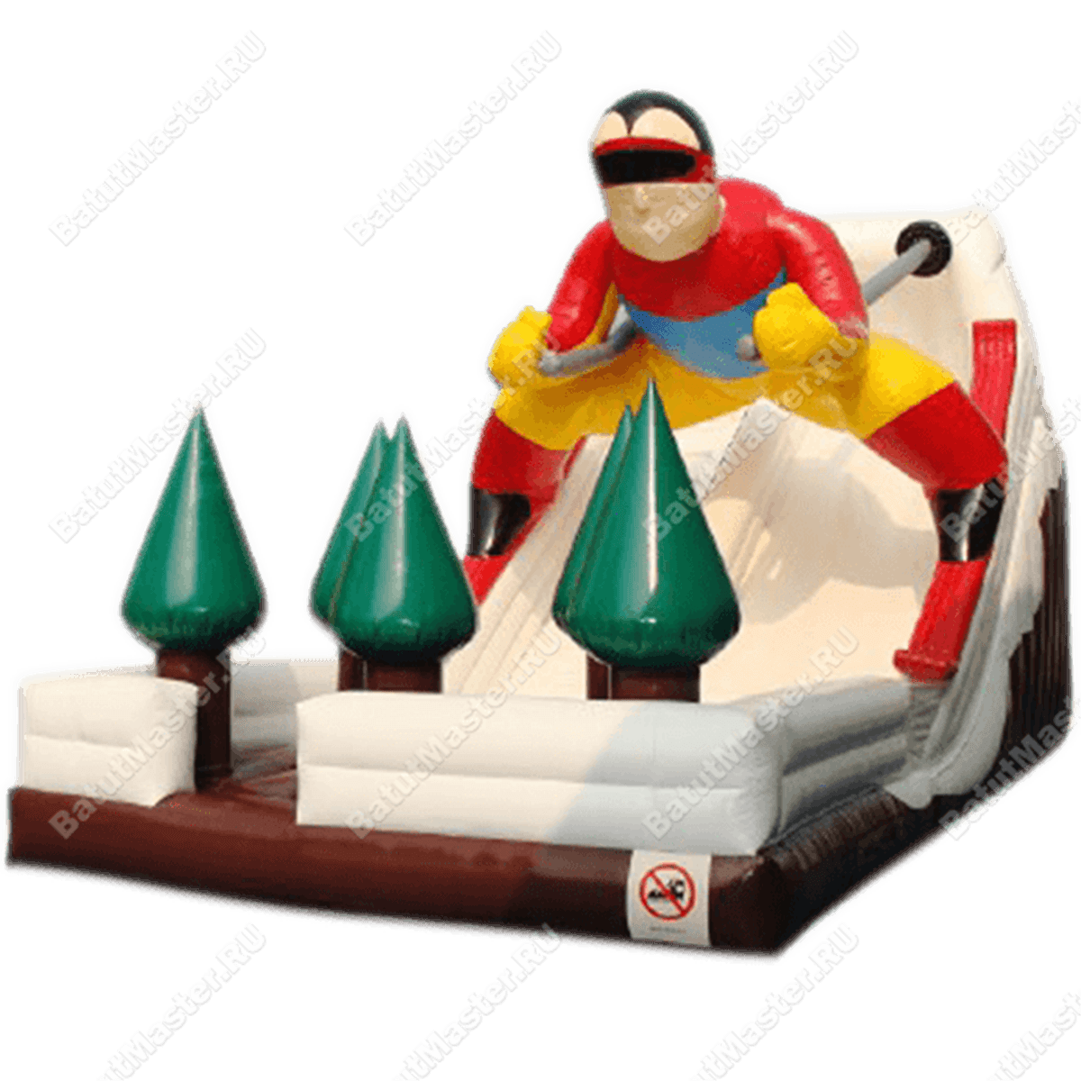Трудно и представить более интересный дизайн, чем огромный лыжник, спускающийся с высоких снежных гор, под которым проходит надувная горка – настоящая трасса из ПВХ. Сам спуск вместе с подъемом выполнены в белом цвете, но ступеньки разноцветные. Нижняя часть яркого батута и площадка после спуска – коричневая с множеством игровых фигур в виде деревьев с зелеными кронами.