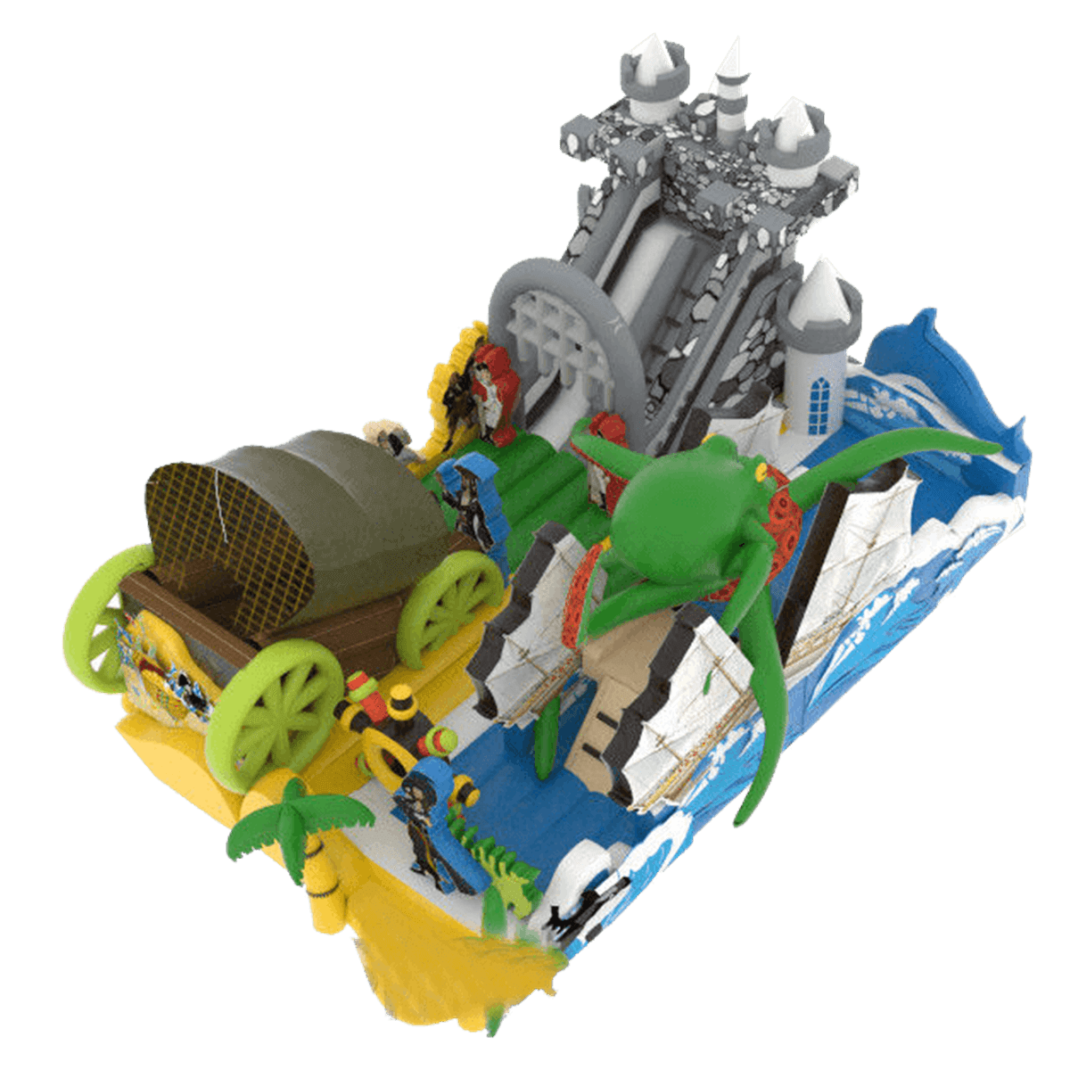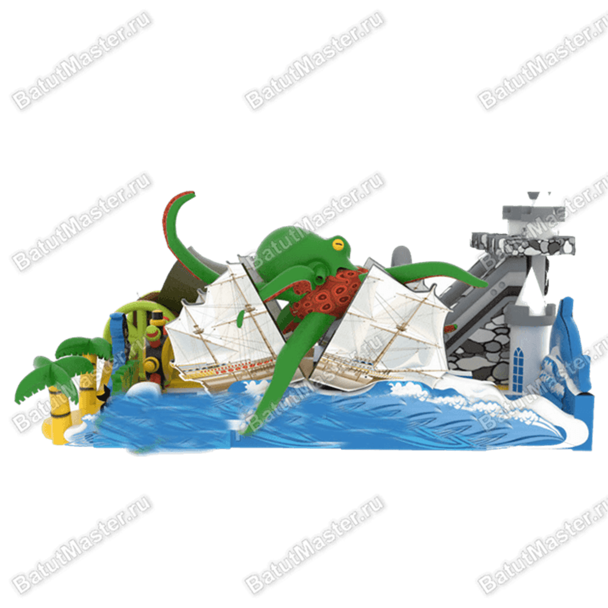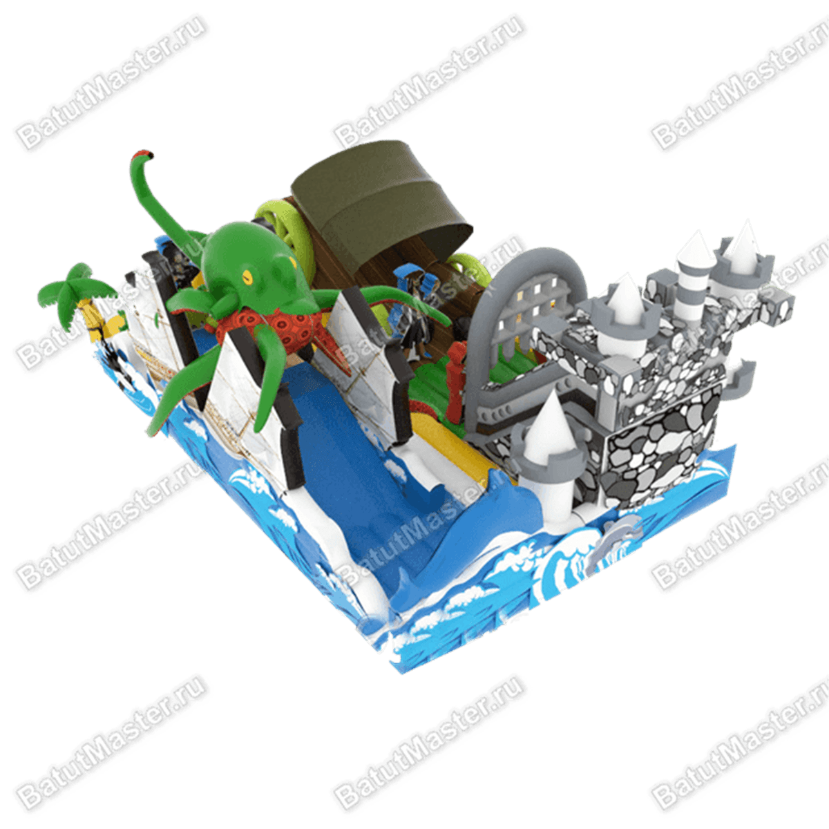 Надувной батут со сложнейшим дизайном как будто вышел к своим посетителям из морской пучины. Пираты, осьминоги, повозки, ящики с сокровищами – все это можно найти на одной площадке с увлекательным спуском вниз. Низ конструкции изготовлен в виде морских бушующих волн, из которых выпрыгивают дельфины и показываются целые башни. Самым интересным элементом является средневековый замок, внутри которого проложен спуск и проходит он через огромные ворота. Одна из боковых стен изображает разбившийся парусник и из него опять выходят горка синего цвета. Штурвалы, пальмы и яркие цвета делают надувной батут интересным. Каждый посетитель обязательно найдет чем заняться на такой площадке и сможет представить себя настоящим Джеком Воробьем.