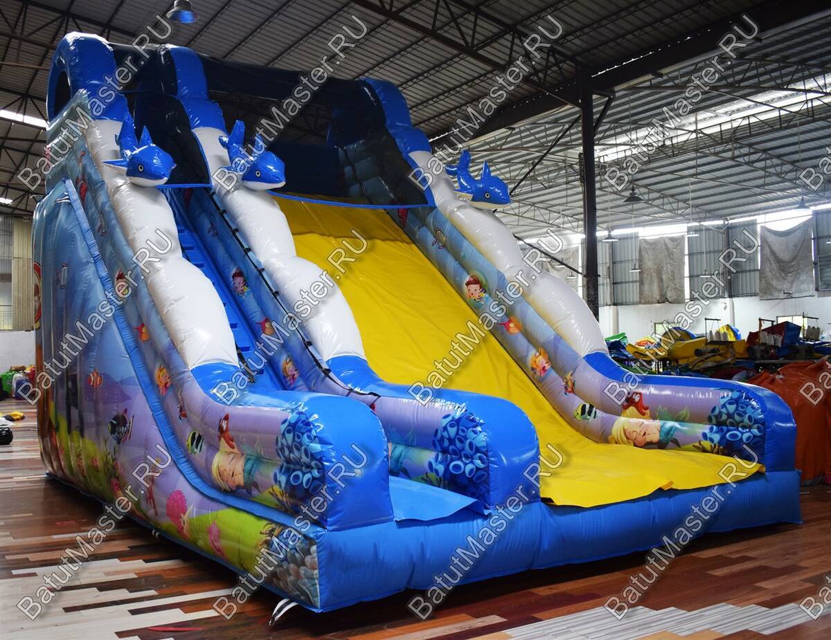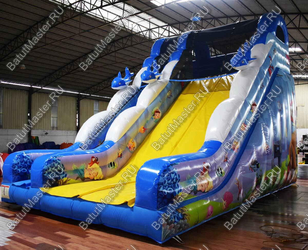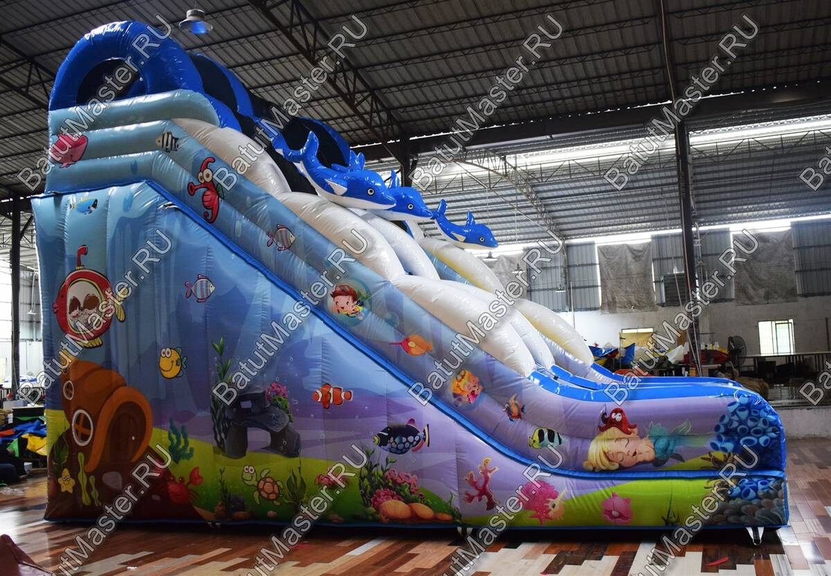 Надувной спуск для бизнеса выполнена в радужных ярких тонах с многочисленными изображениями обитателей морских глубин. Она как нельзя лучше подойдет для пляжной территории и будет востребована детьми разного возраста. Стоит отметить, что она оснащена широким спуском, а именно это хороший вариант для того, чтобы спускаться одновременно было всем вместе. Это увлекательно и забавно. Удобный подъем с мягкими порожками обеспечит безопасный подъем.