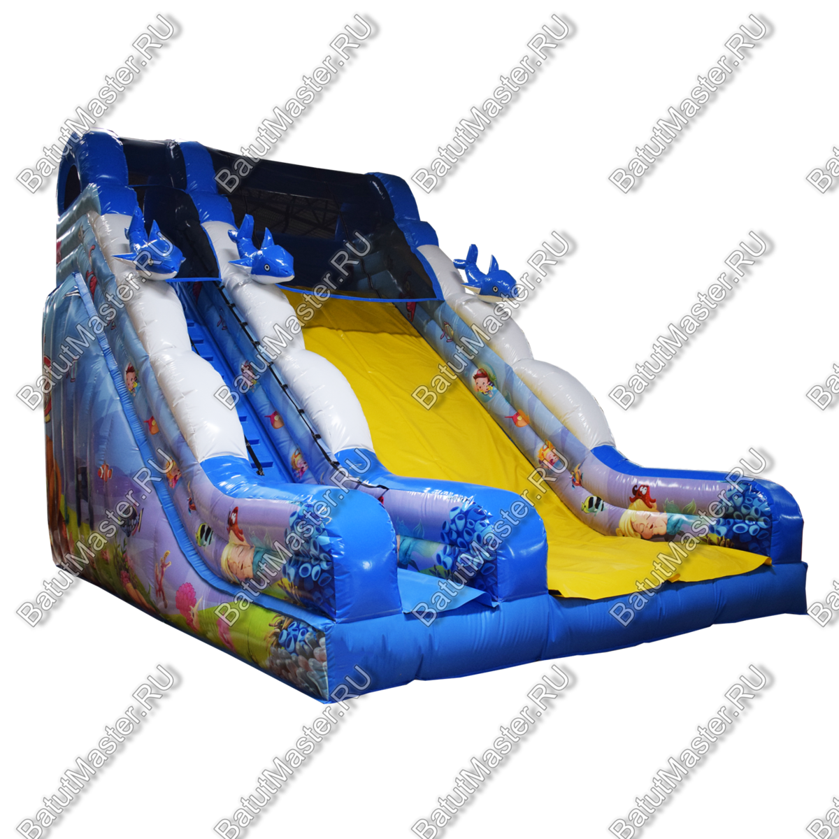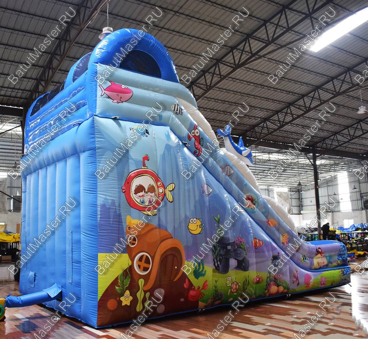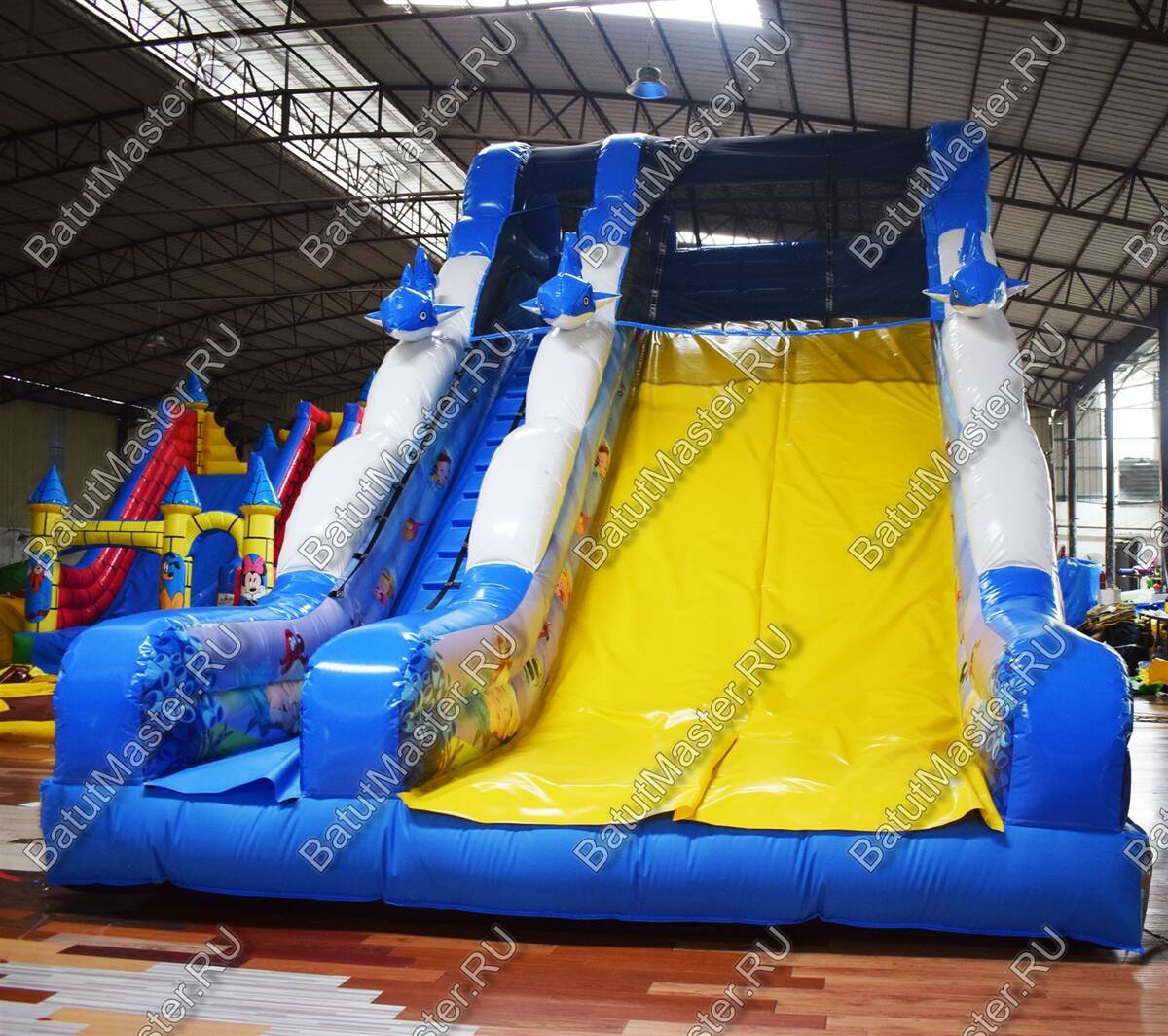 Надувной спуск для бизнеса выполнена в радужных ярких тонах с многочисленными изображениями обитателей морских глубин. Она как нельзя лучше подойдет для пляжной территории и будет востребована детьми разного возраста. Стоит отметить, что она оснащена широким спуском, а именно это хороший вариант для того, чтобы спускаться одновременно было всем вместе. Это увлекательно и забавно. Удобный подъем с мягкими порожками обеспечит безопасный подъем.