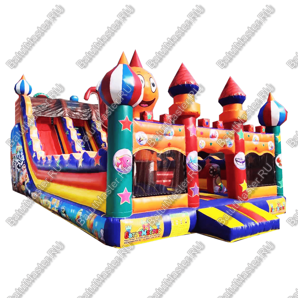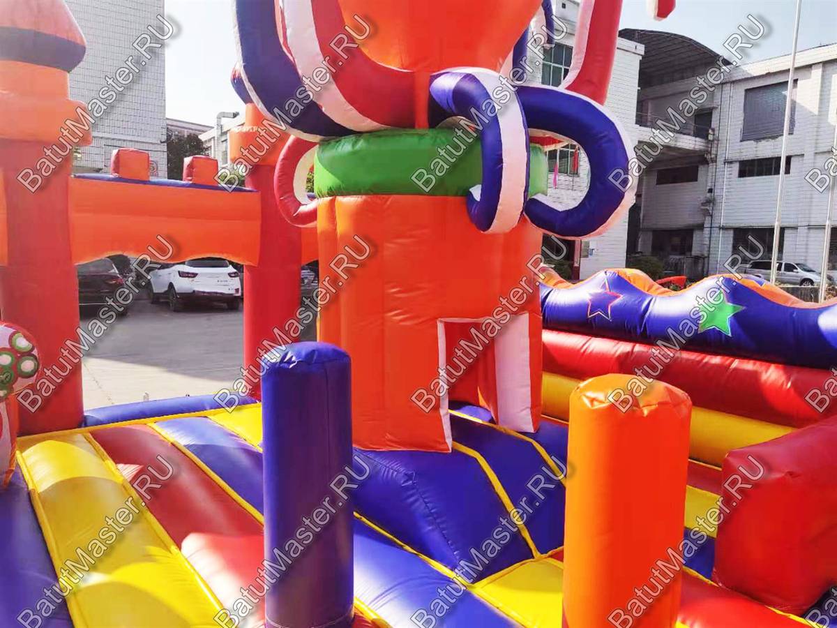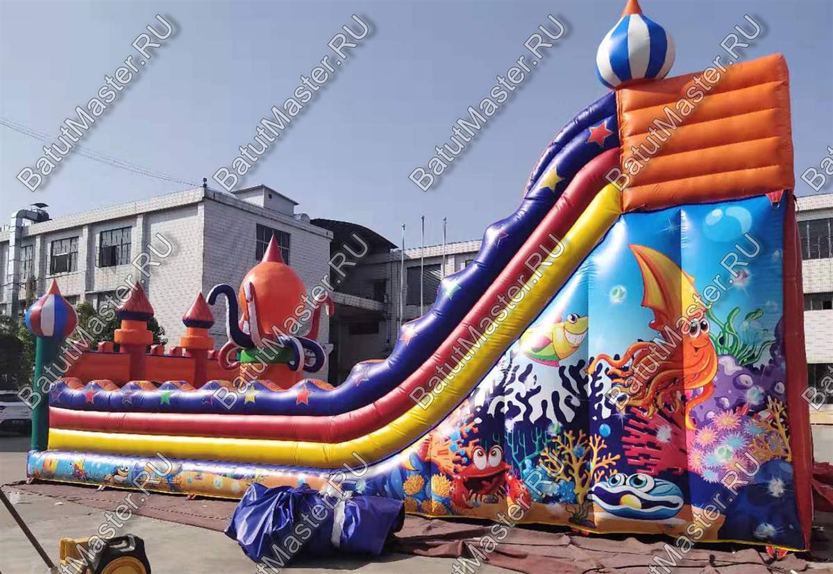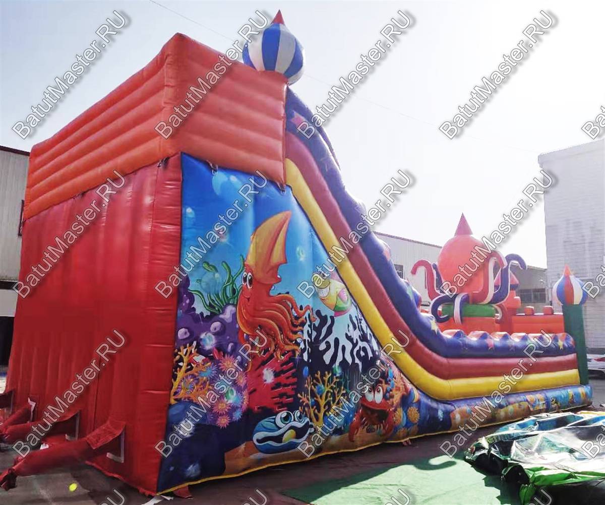 Надувной батут «Осьминог на вершине» обладает размерами 12 на 6 м и высотой 7 м и представляет собой коммерческую высокую горку. Ключевым элементом батута для бизнеса является огромный надувной осьминог, установленный на надувной башне в виде высокого цилиндра. Передняя стена площадки абсолютно прозрачная и изготовлена из сетки, поддерживаемой 4 опорными надувными колоннами, 2 из которых вверху украшены триколорными башнями. Такие элементы придают фасаду вид крепостной стены, а всей конструкции – вид замка.