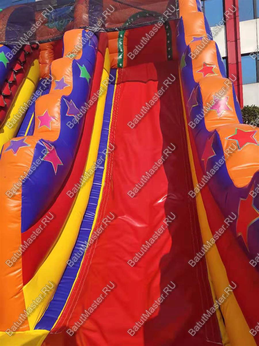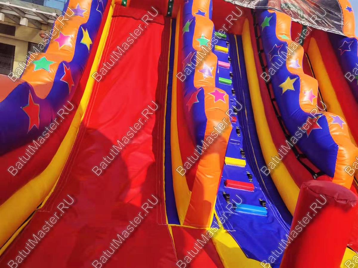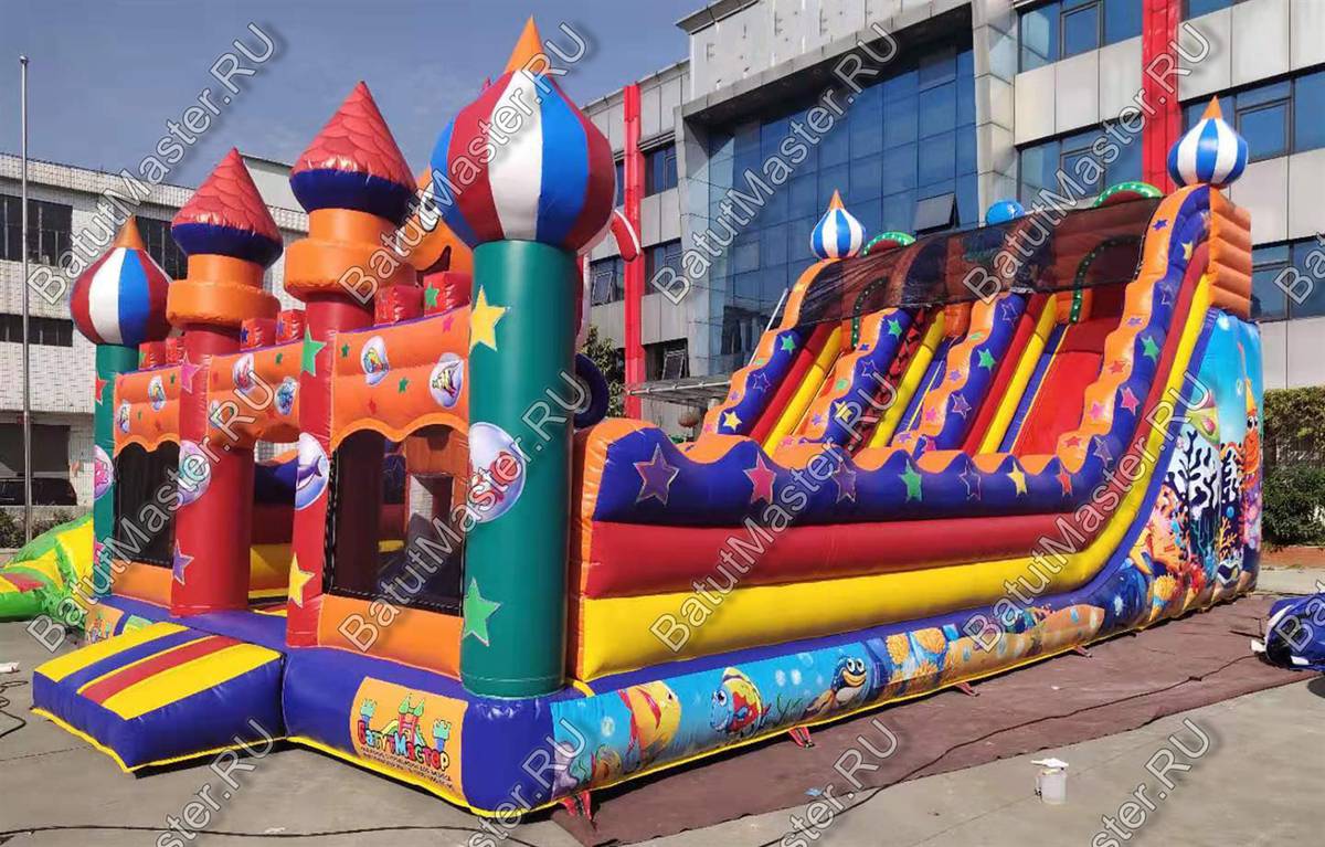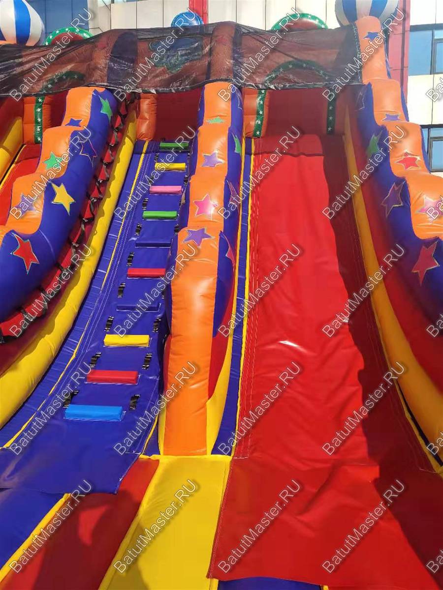 Надувной батут «Осьминог на вершине» обладает размерами 12 на 6 м и высотой 7 м и представляет собой коммерческую высокую горку. Ключевым элементом батута для бизнеса является огромный надувной осьминог, установленный на надувной башне в виде высокого цилиндра. Передняя стена площадки абсолютно прозрачная и изготовлена из сетки, поддерживаемой 4 опорными надувными колоннами, 2 из которых вверху украшены триколорными башнями. Такие элементы придают фасаду вид крепостной стены, а всей конструкции – вид замка.