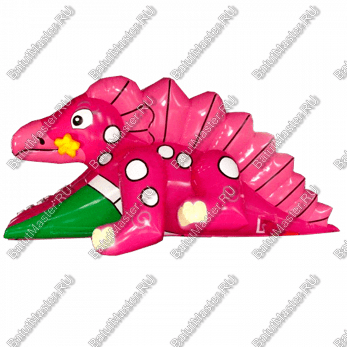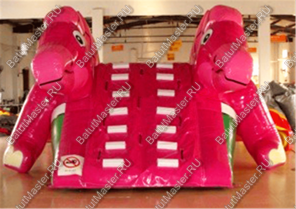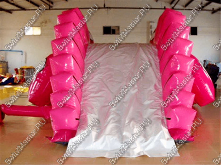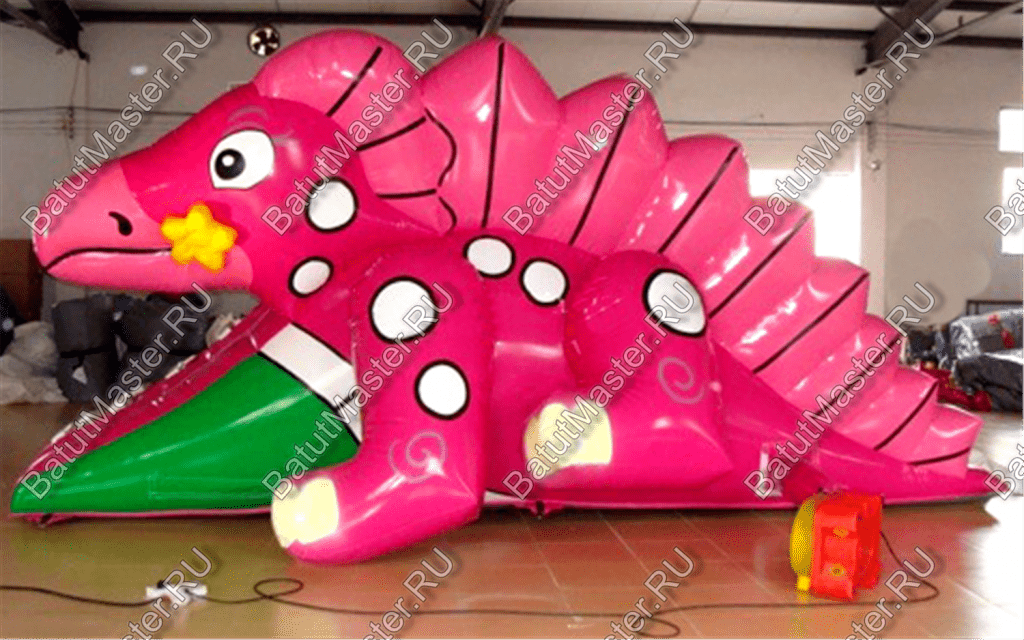 Мягкая надувная горка в виде забавного розового динозавра с плавным скольжением поднимет детям настроение на весь день.