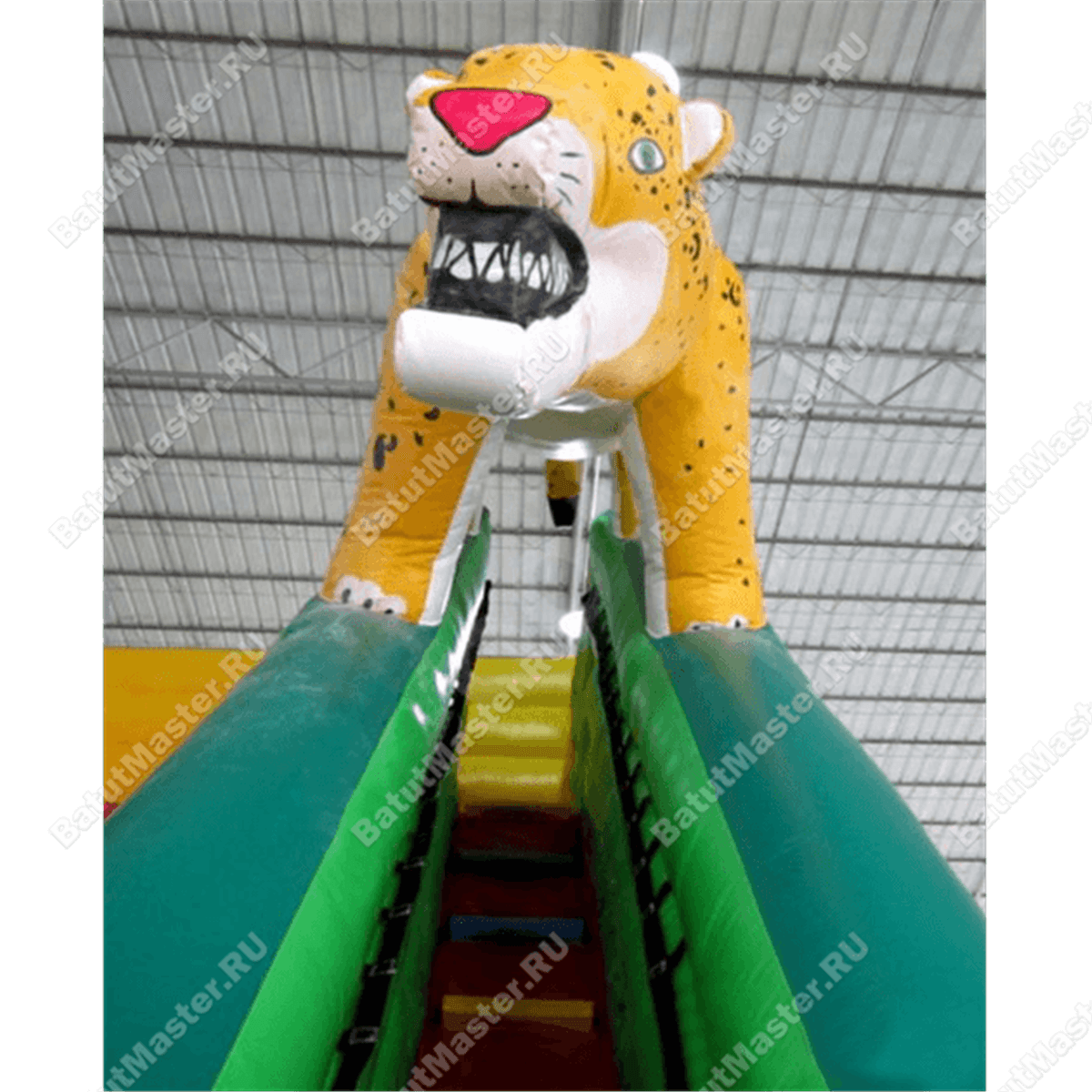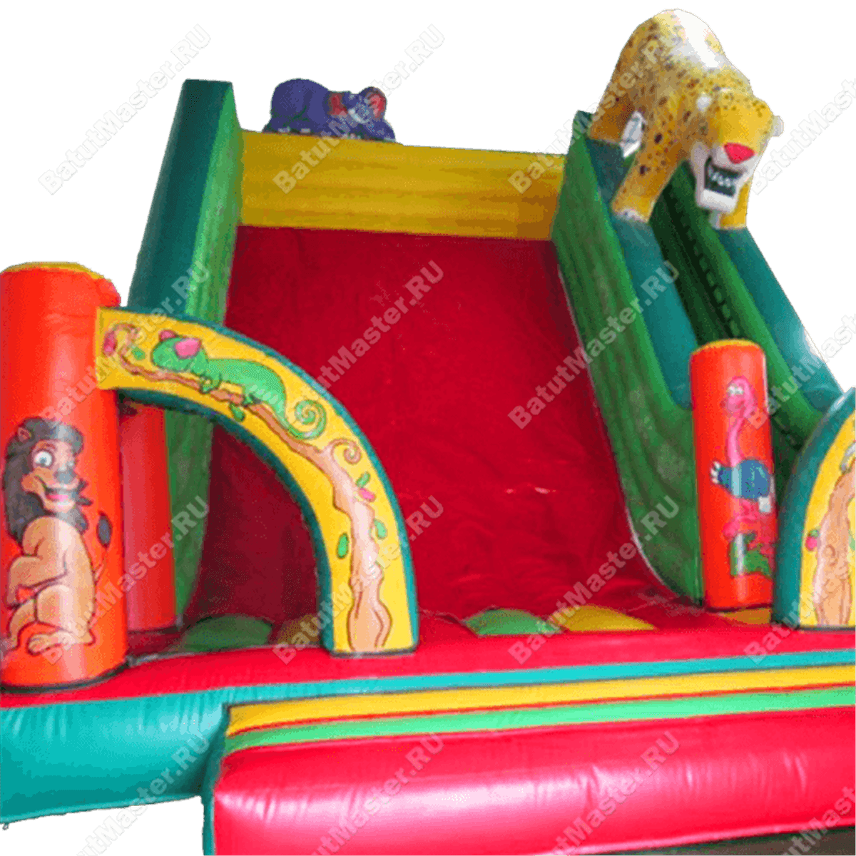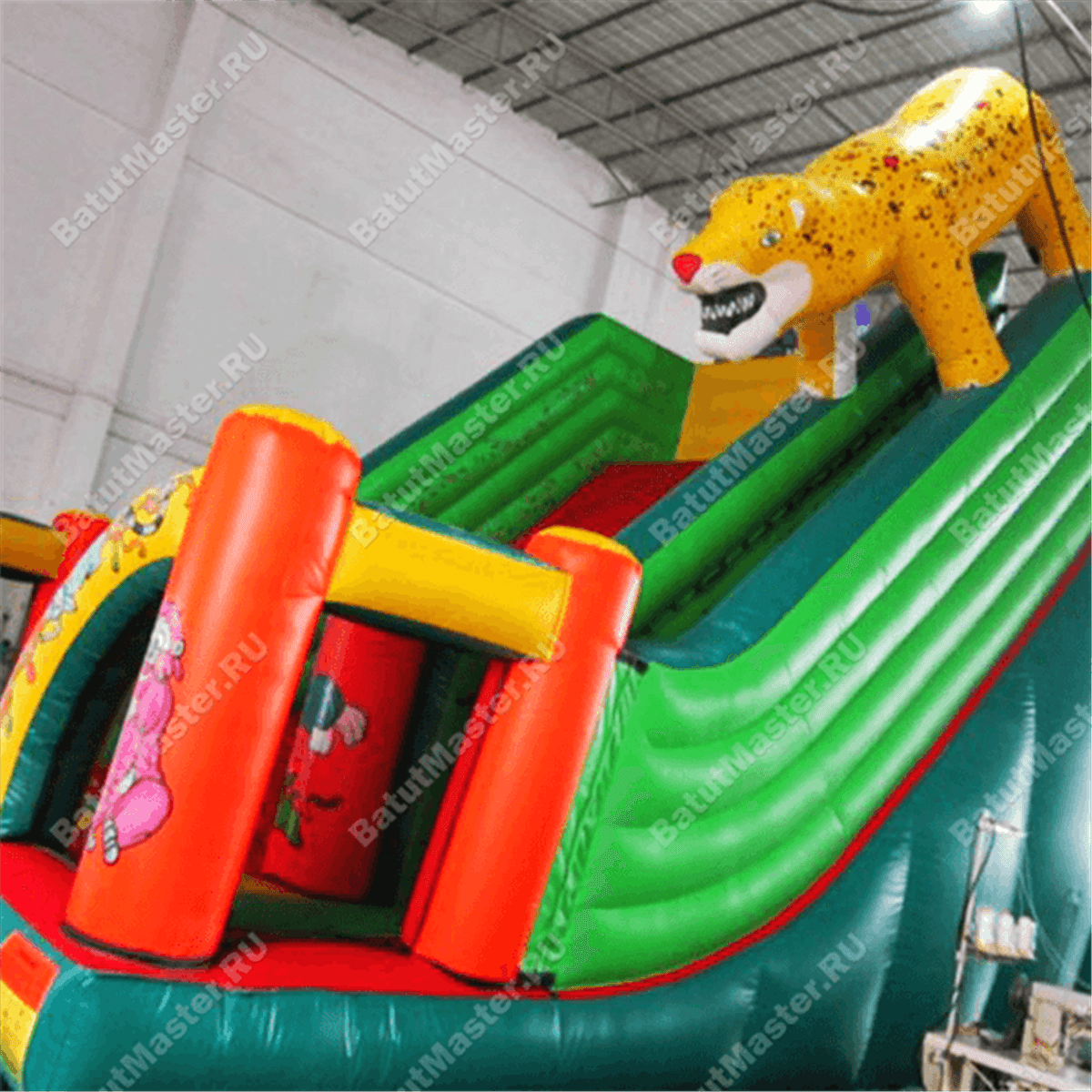 Правая сторона батута отведена под лестницу – на мягком полотне прочно прикреплены разноцветные ступеньки. Верхнюю часть лестничного пролета украшает надувной тигр, как будто скользящий сверху батута. Оставшаяся часть полотна – это большая широкая горка, ярко красный материал высокой прочности помещает на себе сразу группу малышей, поэтому нет нужды скатываться с высоты в одиночку.