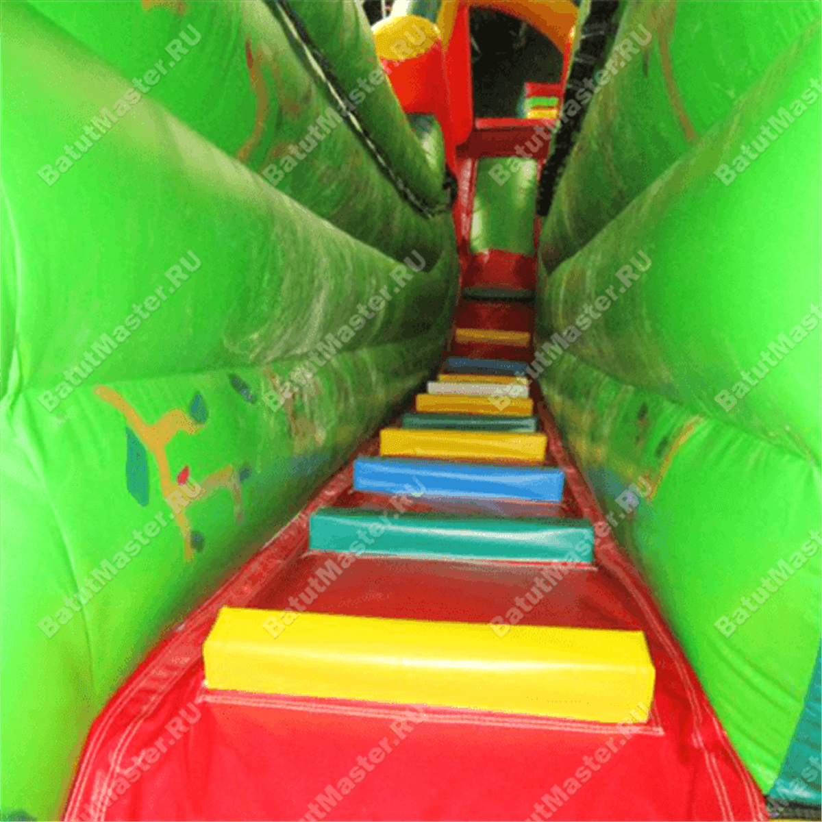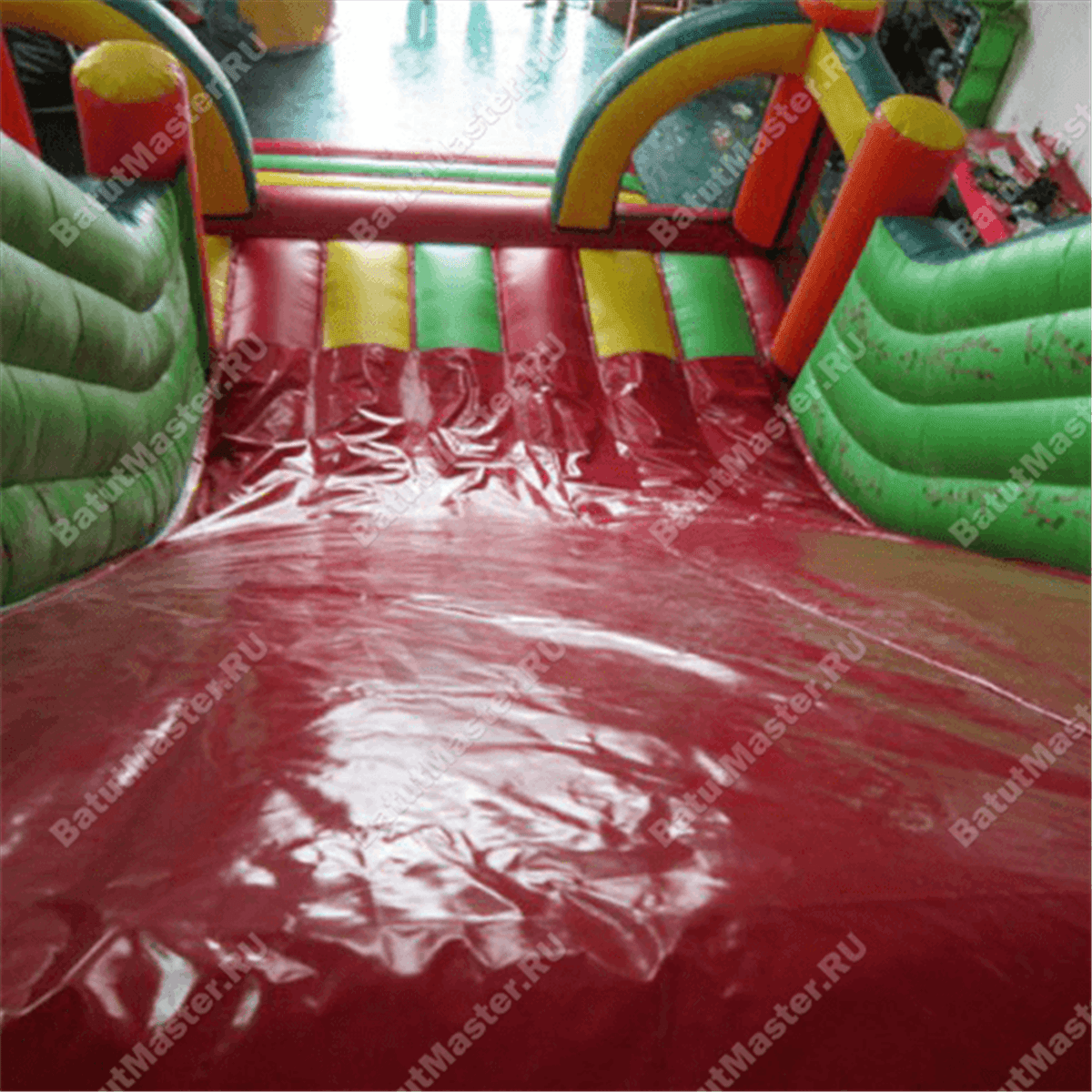 У подножия спуска достаточно места для того, чтобы уверенно затормозить, поэтому крохи не выпадут за пределы надувной плоскости. К тому же перед входом имеется дополнительный порожек безопасности такой же высоты, как и основа аттракциона.