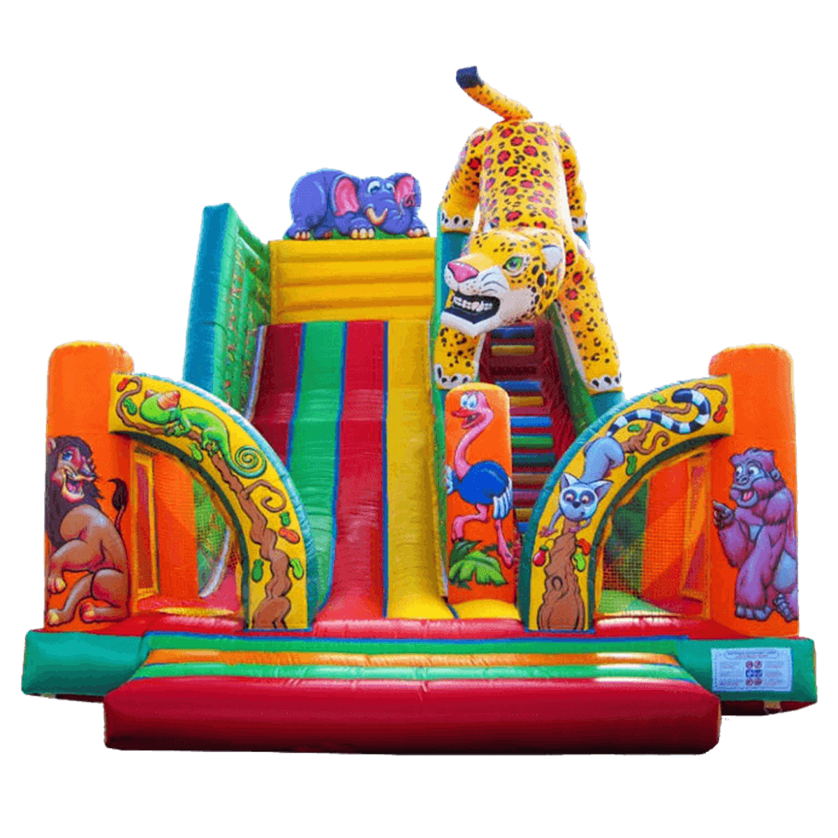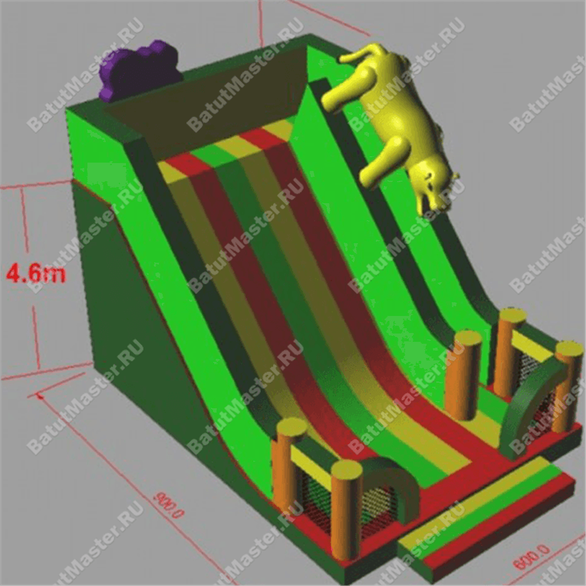 Надувная горка «Танзания» - это огромная надувная гора с яркими надувными дополнениями. Вход внутрь аттракциона полностью открыт, лишь по бокам центральной стороны установлены небольшие округлые перегородки-выступы с сетчатой окантовкой.