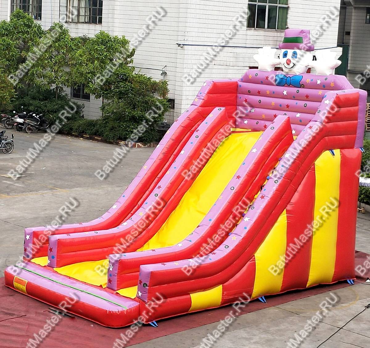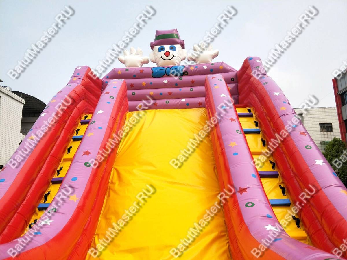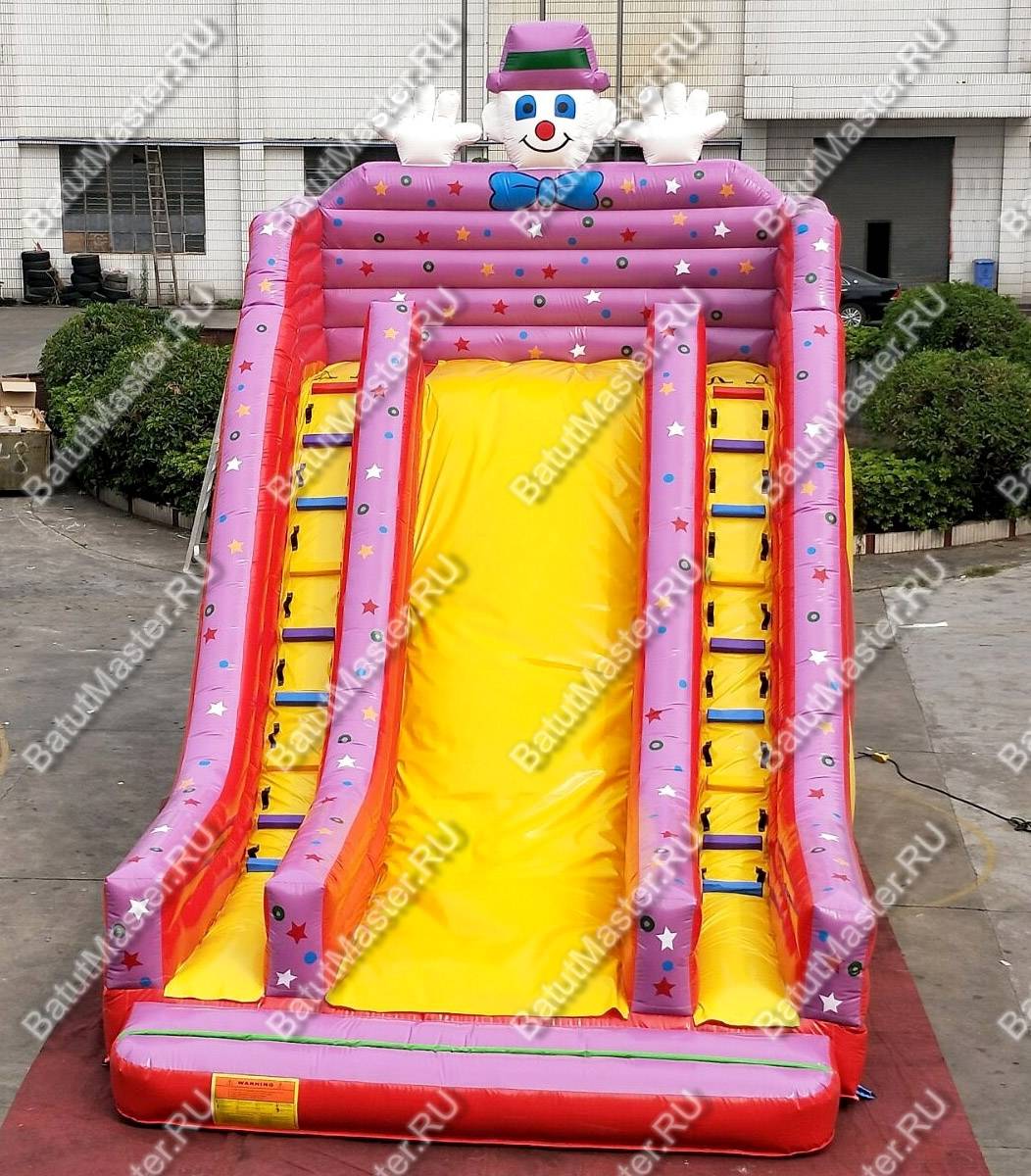 «Весёлый клоун» точно понравится детям. Ну, как можно устоять перед таким обаятельным клоуном, что возвышается над горкой? Его очаровательная улыбка будет располагать к себе, а руки, поднятые в приветливом жесте, звать прокатиться с аттракциона. У клоуна даже есть сиреневая шляпа, синяя бабочка и такое же сиреневое небольшое «туловище» с различными маленькими рисунками. Проработка деталей, пусть даже кажущихся незначительными, будет полезна для бизнеса.