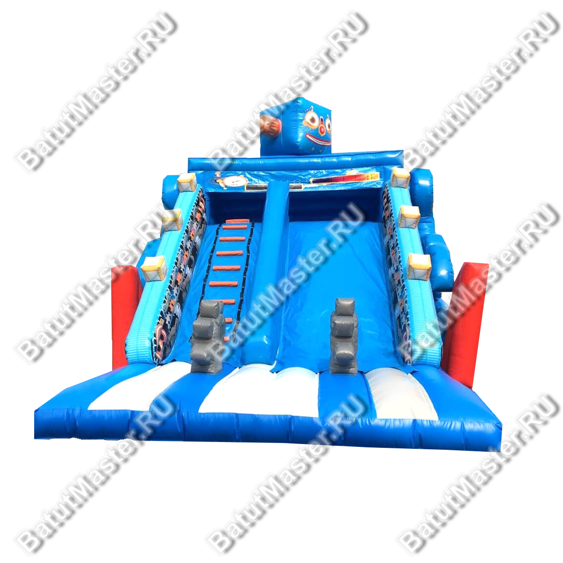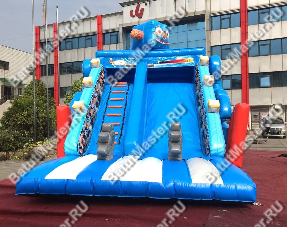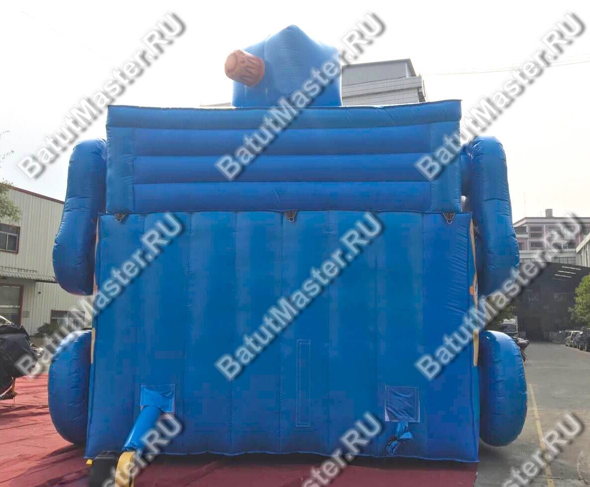 Больше всего внимания будет привлекать голова, которая возвышается над горками. У неё имеются все детали, присущие настоящему роботу. В целом вся конструкция сделана синего цвета, что делает батут ярким и насыщенным. Все детали имеют отличный контраст на общем синем фоне.