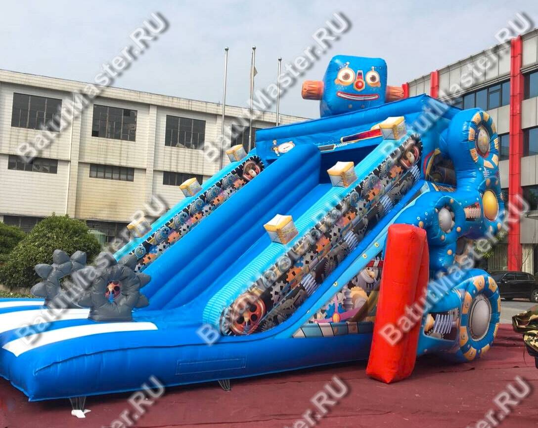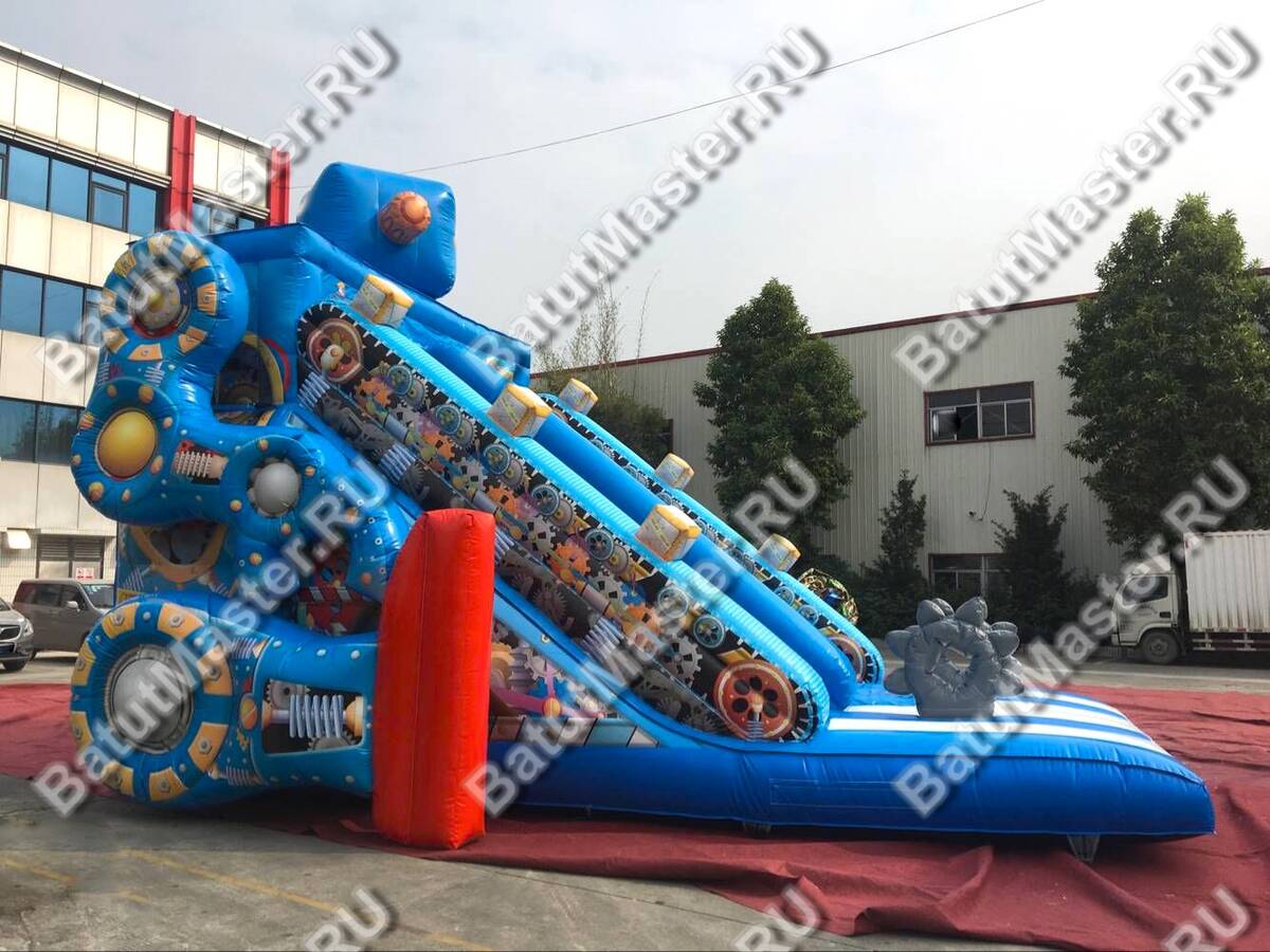 На стенах батута-горки изображены различные детали, без которых ни один робот не сможет функционировать. Внизу детей ожидают две батутные шестерёнки.