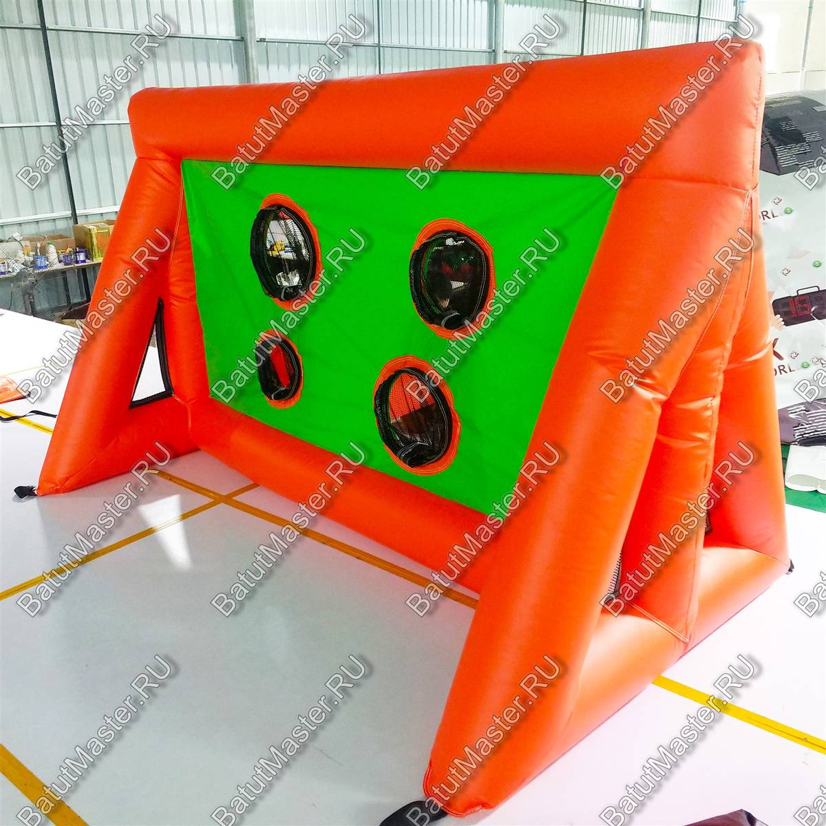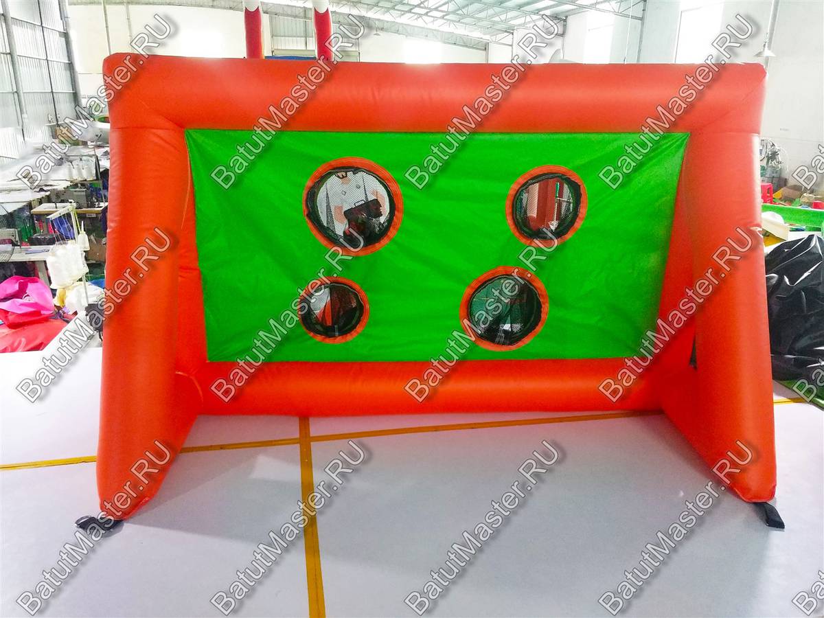 Всего на игровом аттракционе имеется четыре сетчатых отверстия, куда нужно попасть мячом. Каждое из этих отверстий имеет свой диаметр, попасть сложнее будет в самый маленький из них.